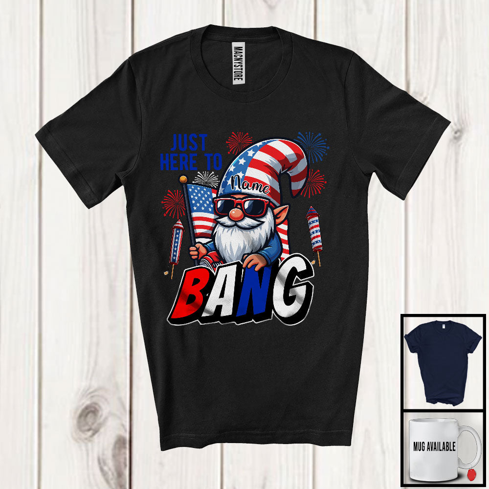 Personalized Custom Name Just Here To Bang, Joyful 4th Of July Gnome, USA Flag Fireworks T-Shirt