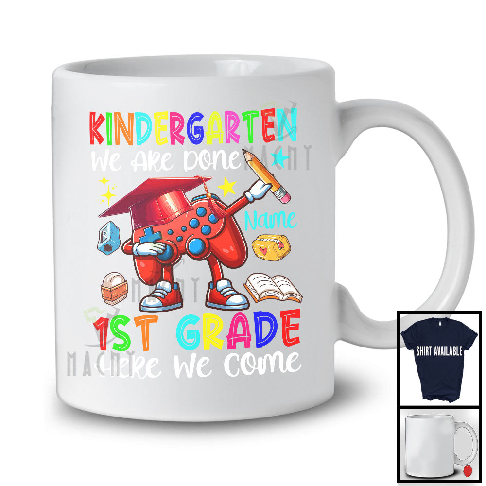 Personalized Custom Name Kindergarten We Are Done 1st Grade, Cute Last First Day Of School Gamer T-Shirt. This cotton t-shirt is a durable staple product with a classic fit. One of the most popular items, it has a relaxed style made for everyday and casual wear.