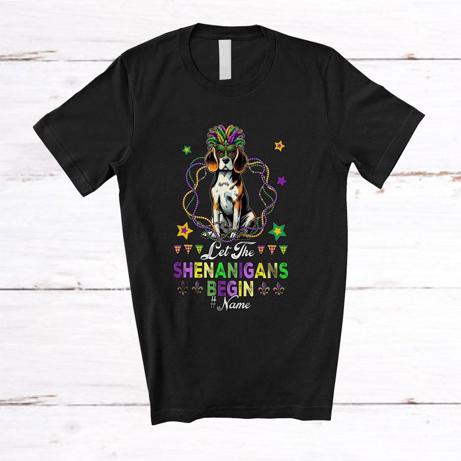 Personalized Custom Name Let The Shenanigans Begin; Joyful Mardi Gras Masked Beagle Beads T-Shirt