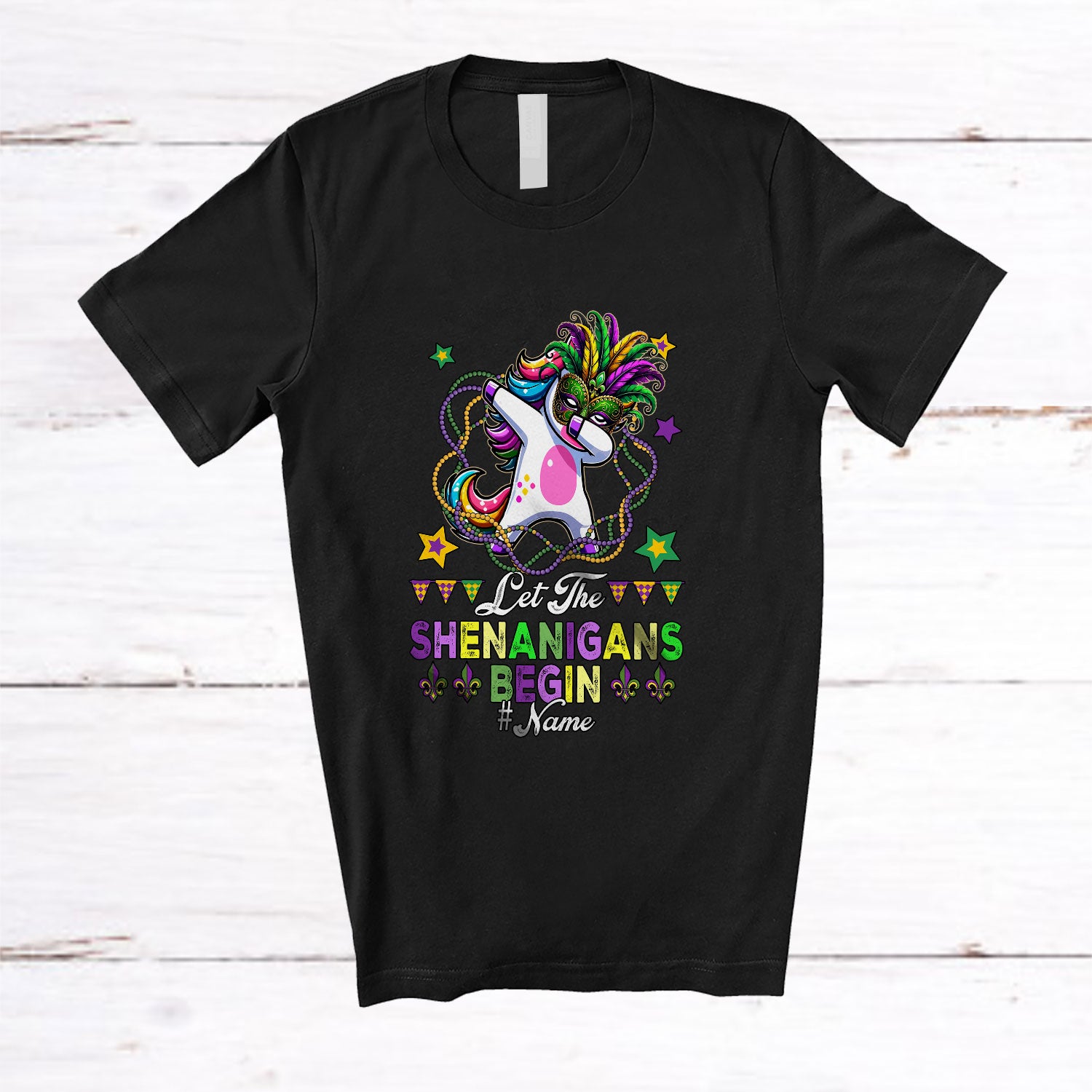 Personalized Custom Name Let The Shenanigans Begin; Joyful Mardi Gras Masked Unicorn Beads T-Shirt. This cotton t-shirt is a durable staple product with a classic fit. One of the most popular items, it has a relaxed style made for everyday and casual wear.