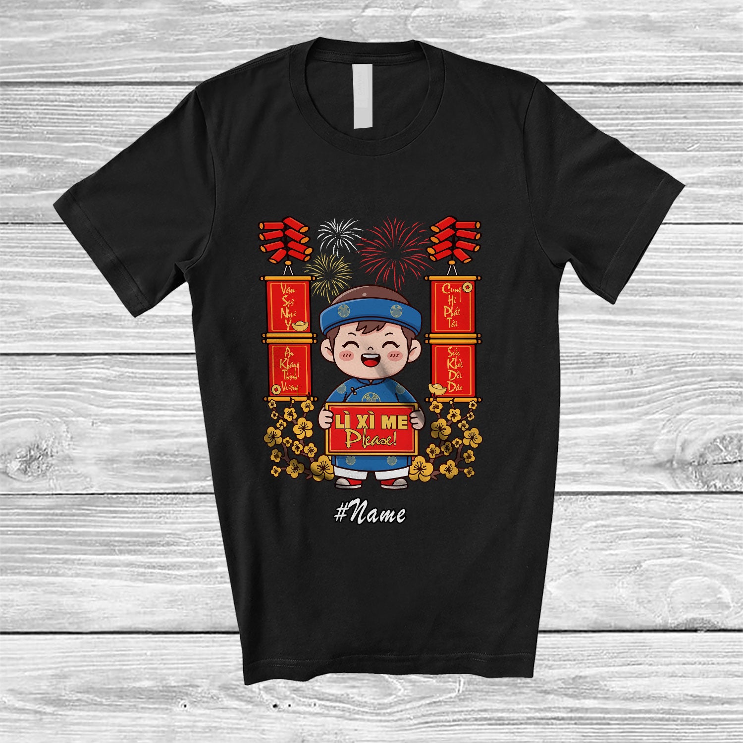• Personalized Custom Name Li Xi Me Please 2026; Joyful Lunar New Year Boy Vietnamese Horse Year T-Shirt. This cotton t-shirt is a durable staple product with a classic fit. One of the most popular items, it has a relaxed style made for everyday and casual wear.