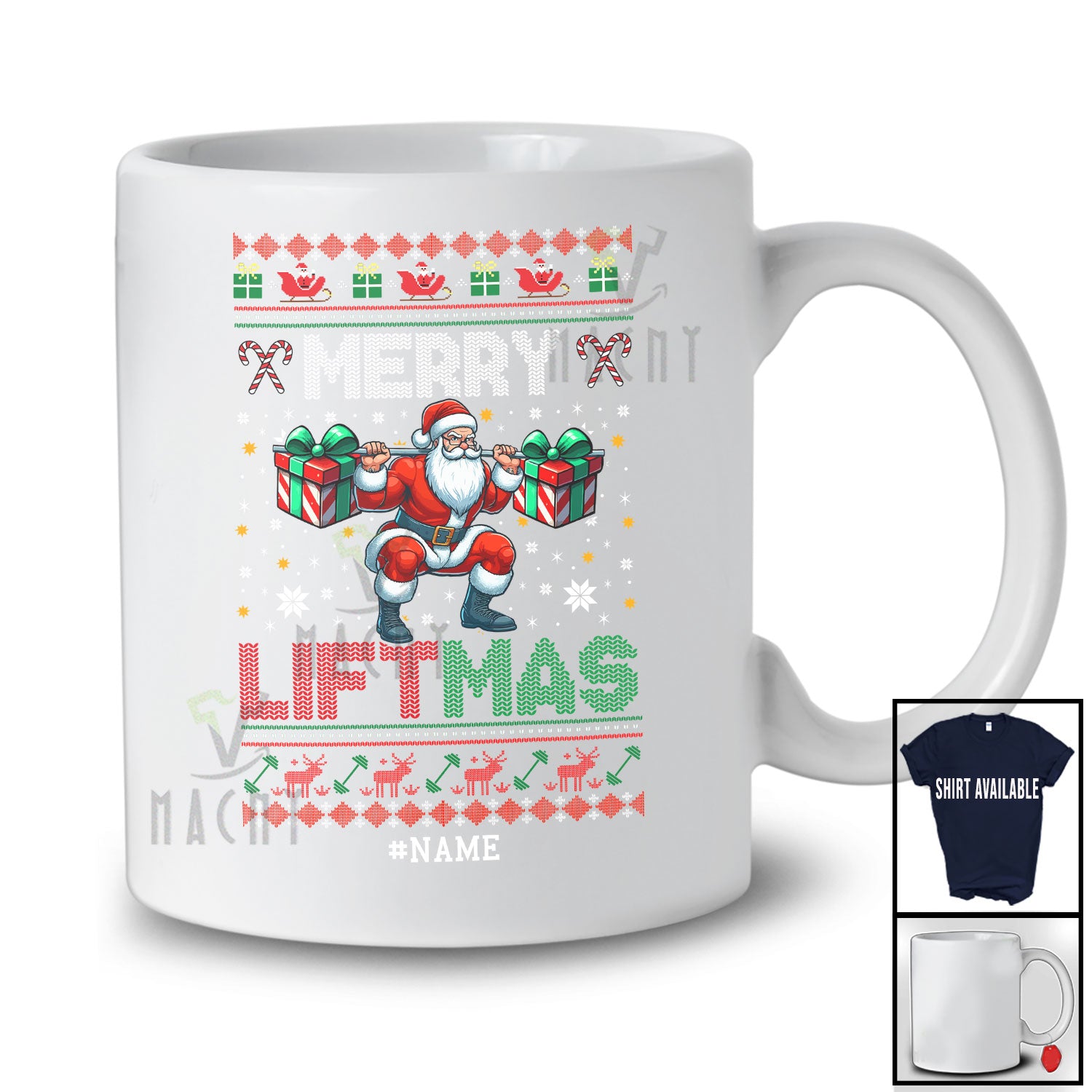 Personalized Custom Name Liftmas; Fantastic Christmas Sweater Santa Weightlifting Present Box T-Shirt. This cotton t-shirt is a durable staple product with a classic fit. One of the most popular items, it has a relaxed style made for everyday and casual wear.