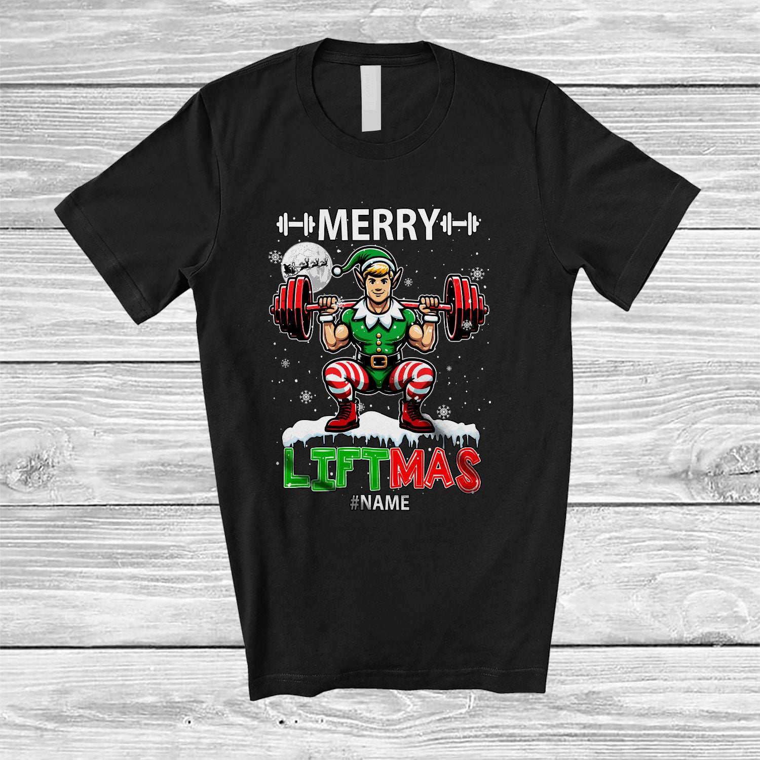 Personalized Custom Name Liftmas; Merry Christmas Muscle Elf Weightlifting; Gym Workout T-Shirt