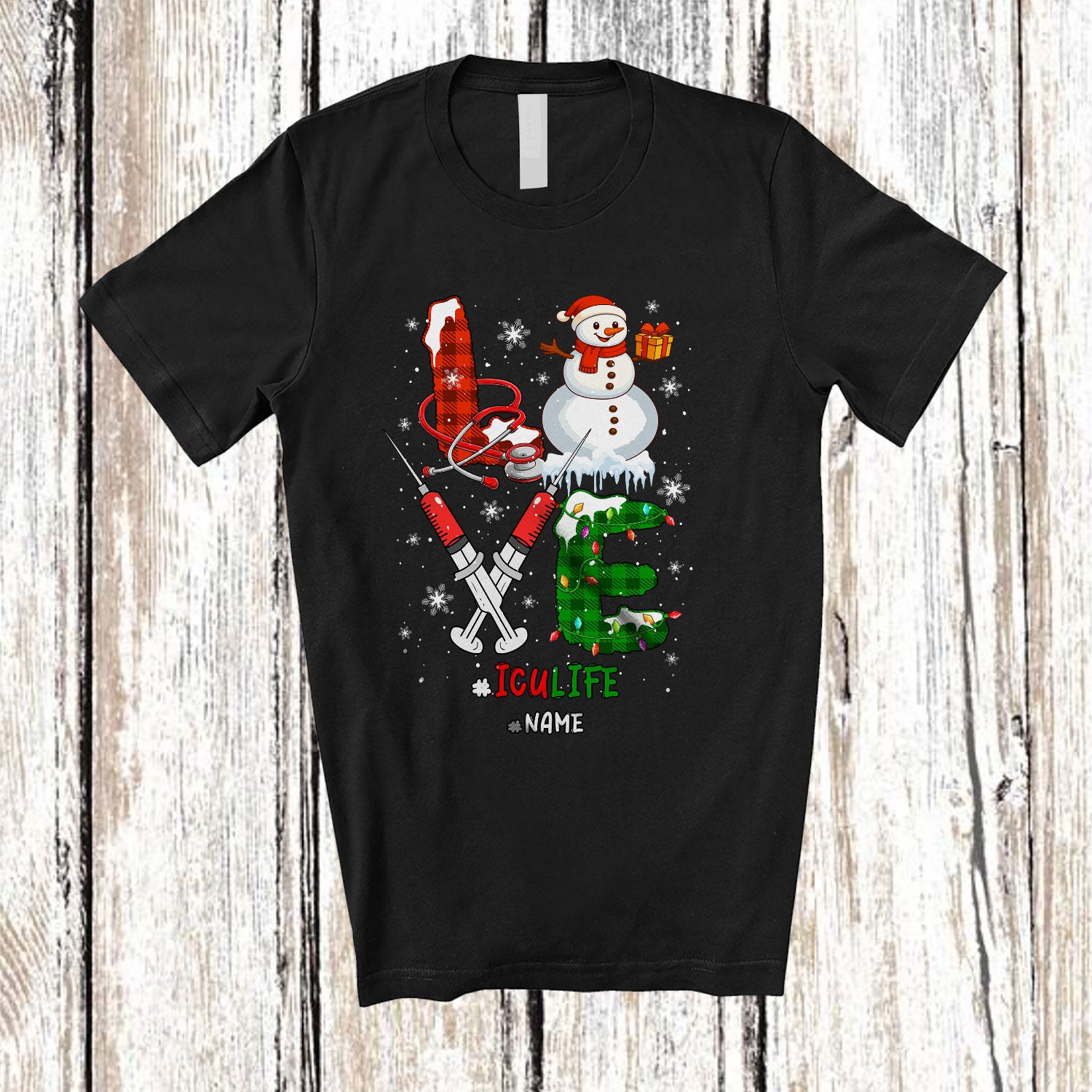 Personalized Custom Name LOVE ICU Life; Merry Christmas Plaid Snowman Needle Stethoscope Nurse T-Shirt