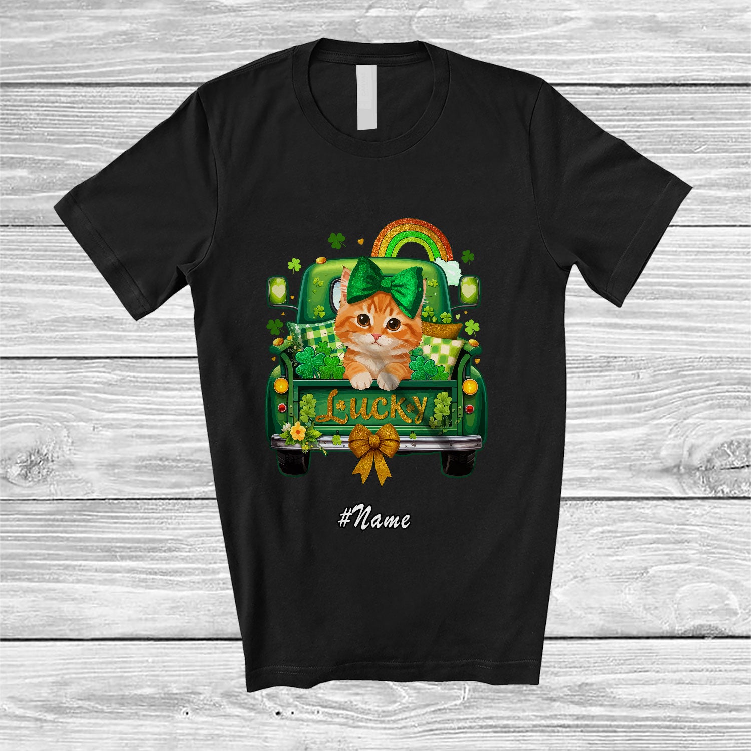 Personalized Custom Name Lucky; Adorable St. Patrick's Day Cat Bow Tie On Pickup Truck T-Shirt. This cotton t-shirt is a durable staple product with a classic fit. One of the most popular items, it has a relaxed style made for everyday and casual wear.