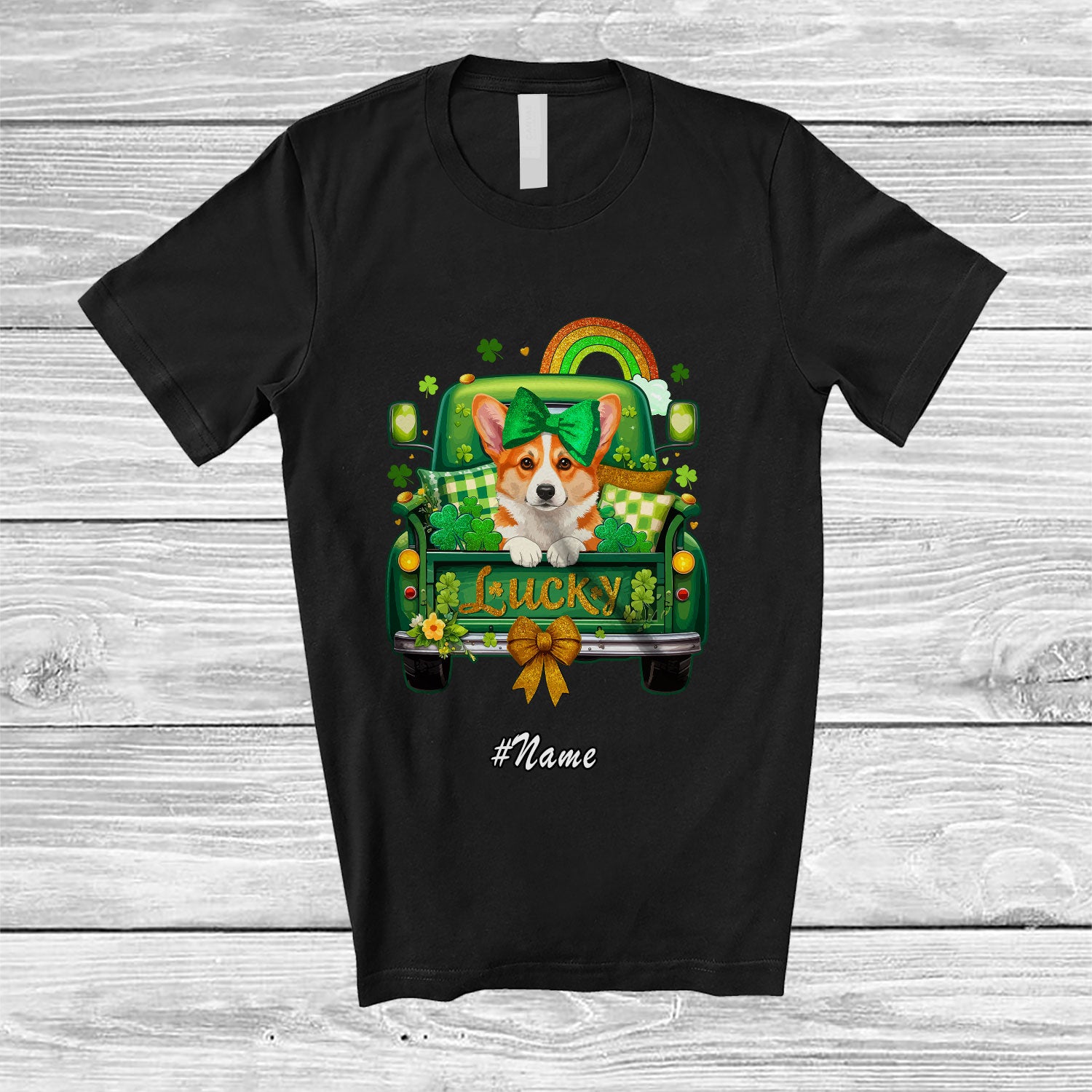 • Every product is unique, just like you. If you're looking for a product that fits the mold of your life, the Personalized Custom Name Lucky; Adorable St. Patrick's Day Corgi Bow Tie On Pickup Truck T-Shirt is for you.