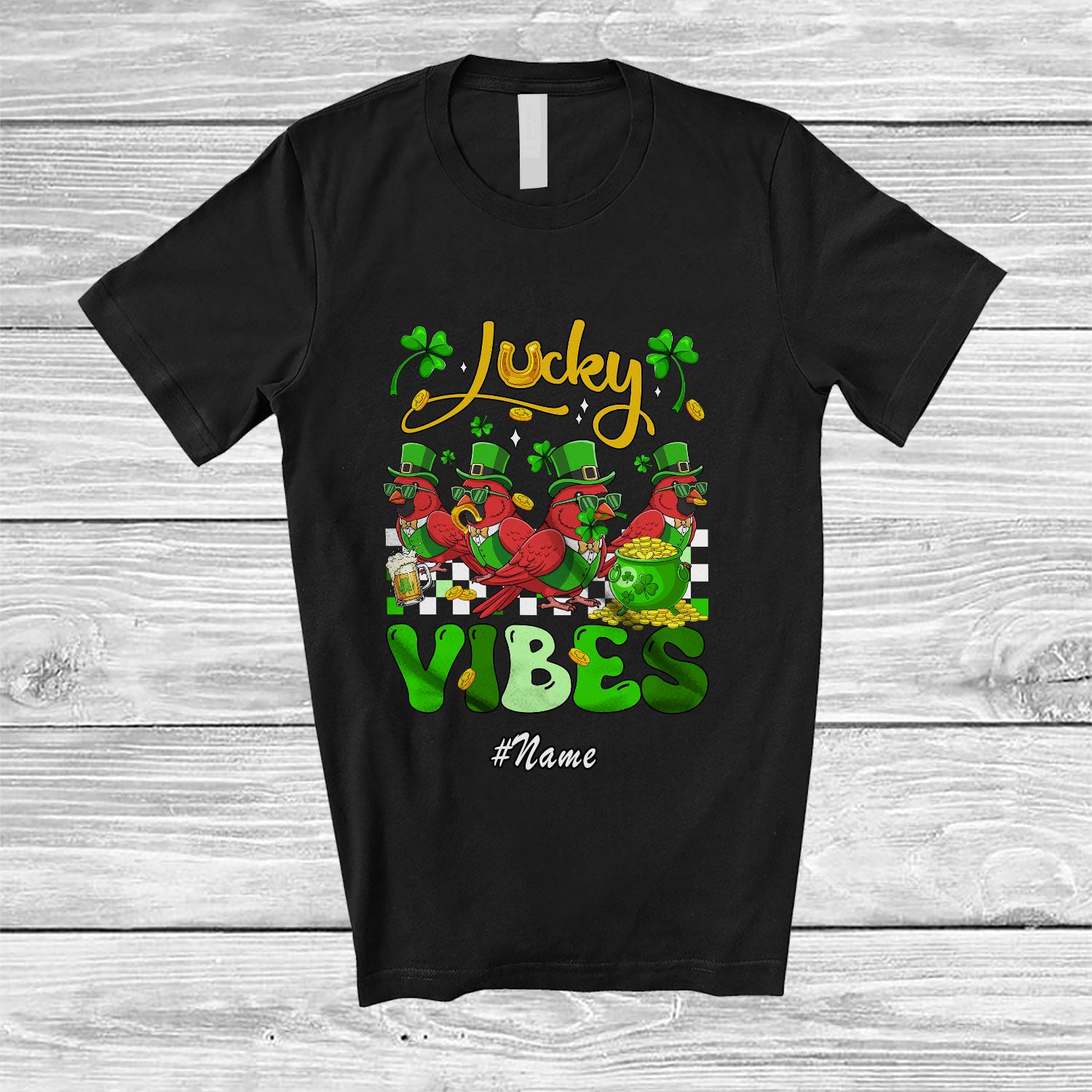 This Personalized Custom Name Lucky Vibes; Humorous St. Patrick's Day Four Cardinal Birds; Shamrock T-Shirt is great idea gift for your family, friends in this birthday, christmas, mother's day, father's day, patrick's day or any holiday.