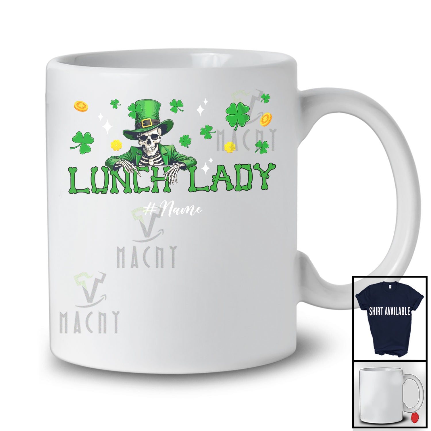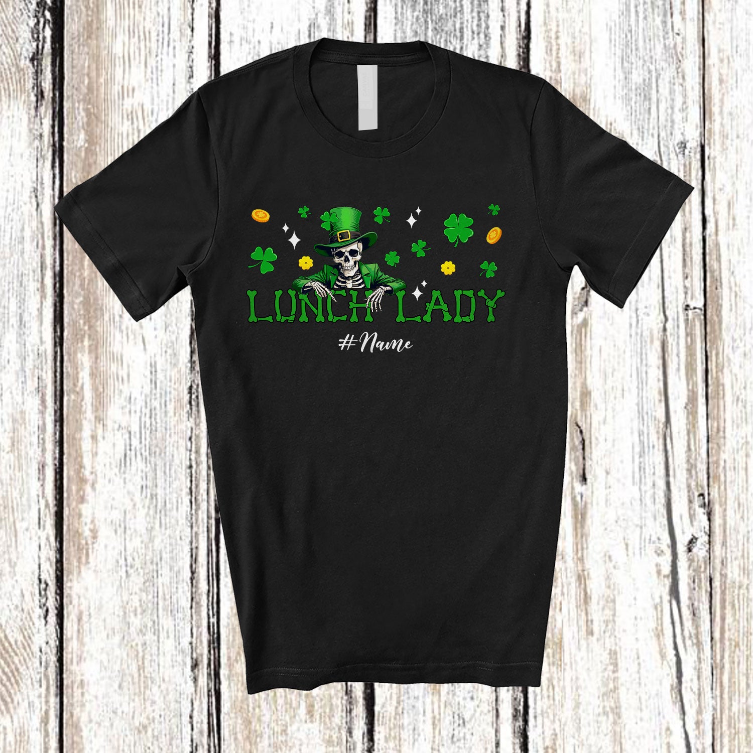 Personalized Custom Name Lunch Lady; Fantastic St. Patrick's Day Leprechaun Skeleton T-Shirt. This cotton t-shirt is a durable staple product with a classic fit. One of the most popular items, it has a relaxed style made for everyday and casual wear.