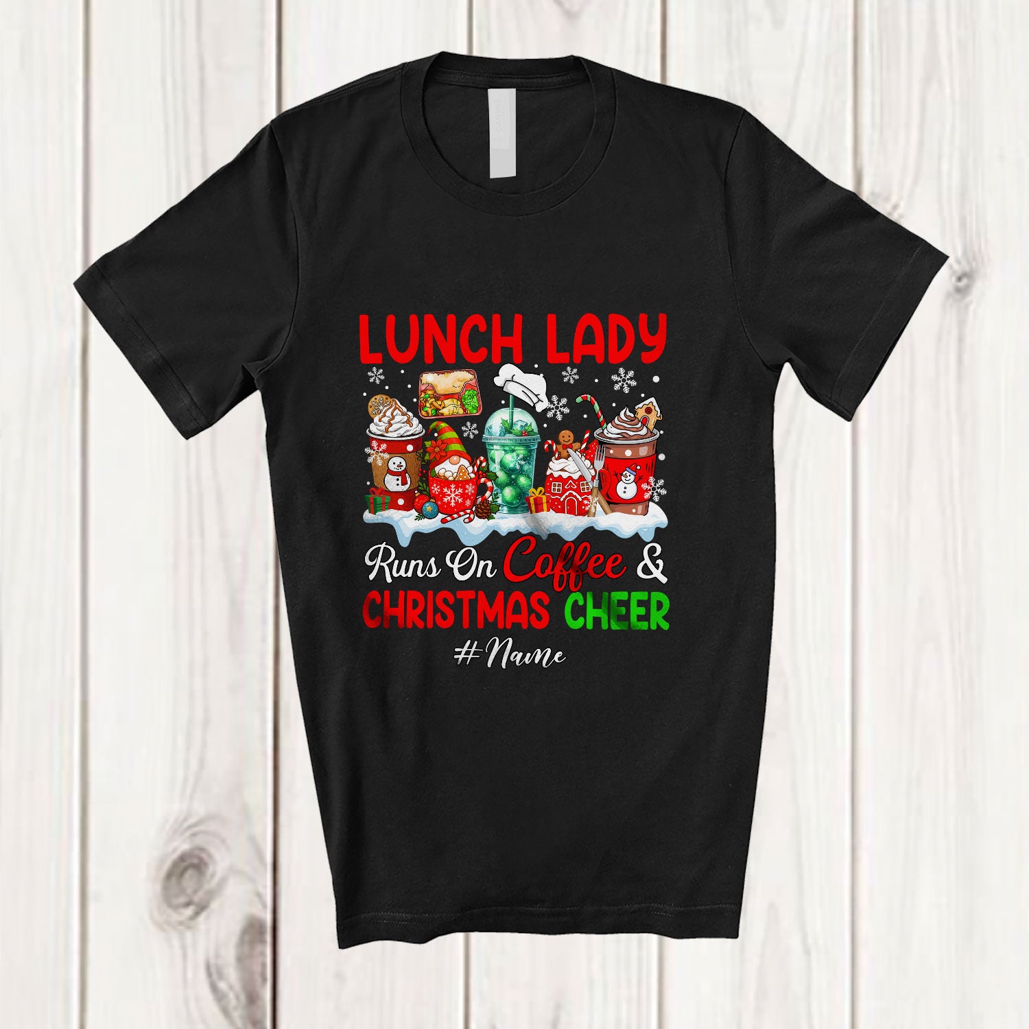 • Personalized Custom Name Lunch Lady Runs On Coffee Christmas Cheer; Lovely Snow Jobs T-Shirt. This cotton t-shirt is a durable staple product with a classic fit. One of the most popular items, it has a relaxed style made for everyday and casual wear.
