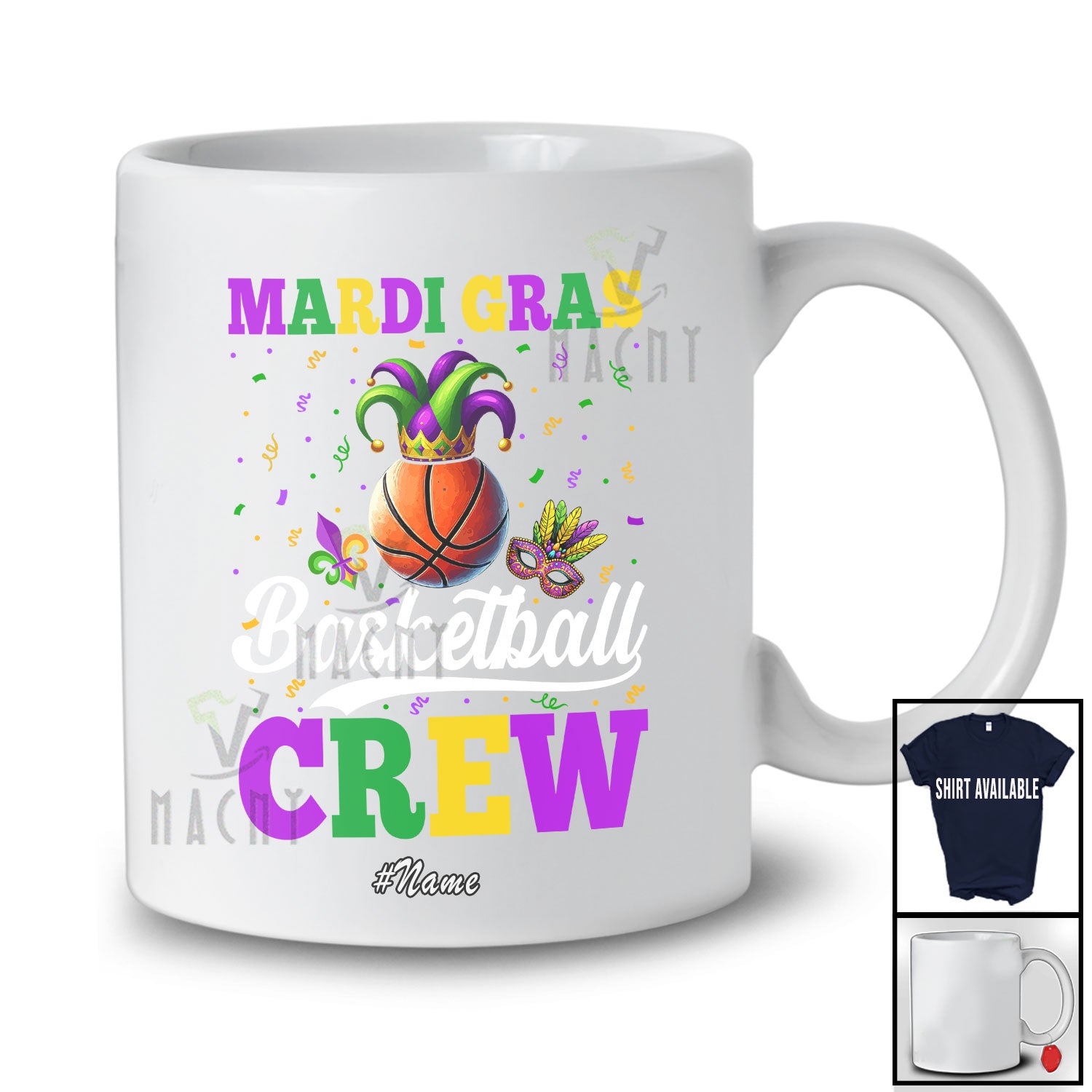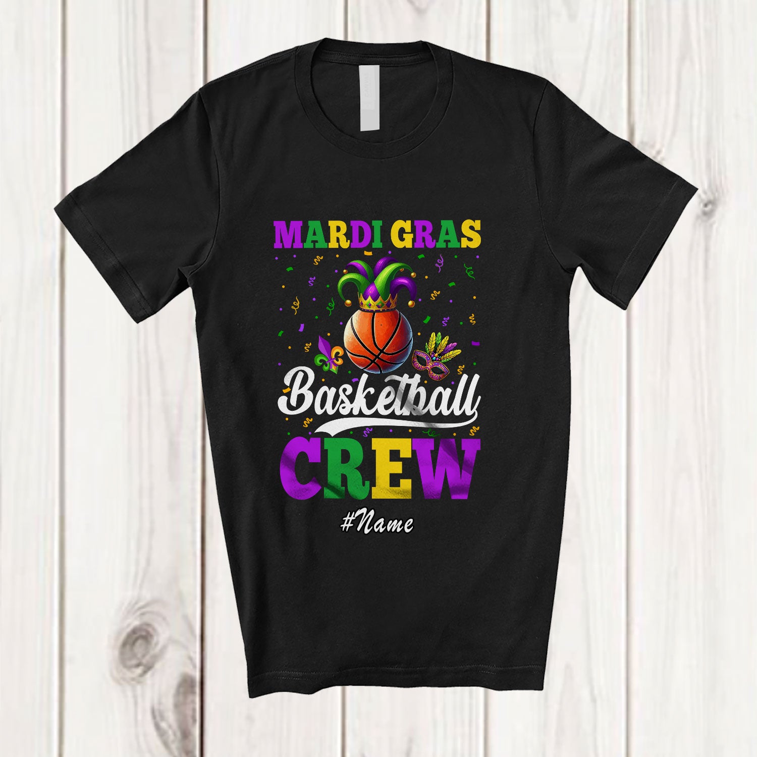 Personalized Custom Name Mardi Gras Basketball Crew; Amusing Mardi Gras Mask; Sport Player Team T-Shirt. This cotton t-shirt is a durable staple product with a classic fit. One of the most popular items, it has a relaxed style made for everyday and casual wear.