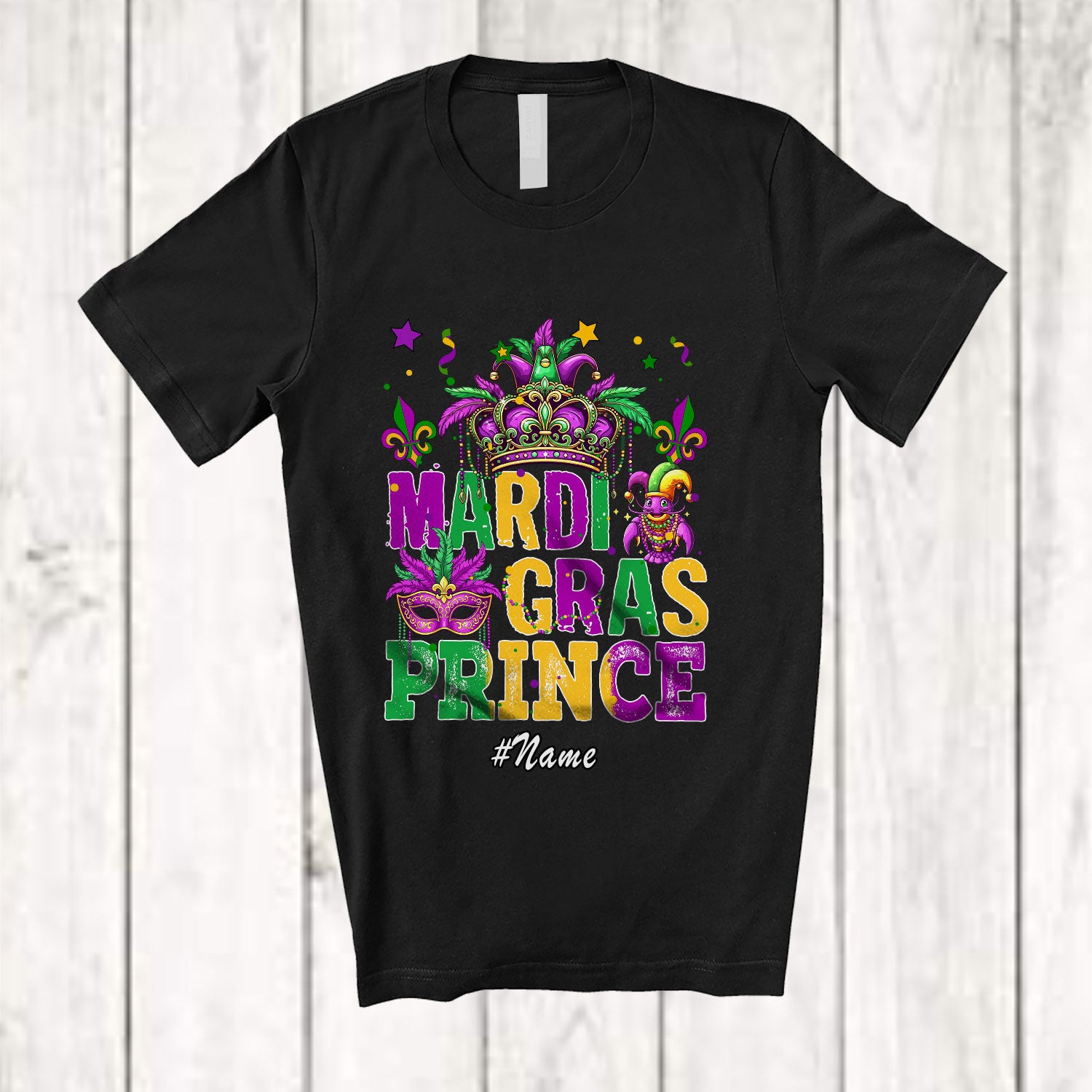 • Personalized Custom Name Mardi Gras Prince; Amusing Mardi Gras Mask Crawfish; Boys Men Parades T-Shirt. This cotton t-shirt is a durable staple product with a classic fit. One of the most popular items, it has a relaxed style made for everyday and casual wear.