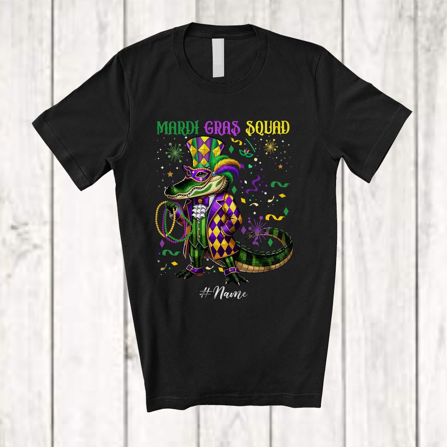 Personalized Custom Name Mardi Gras Squad; Adorable Beads Alligator Cosplay; Parades T-Shirt. This cotton t-shirt is a durable staple product with a classic fit. One of the most popular items, it has a relaxed style made for everyday and casual wear.