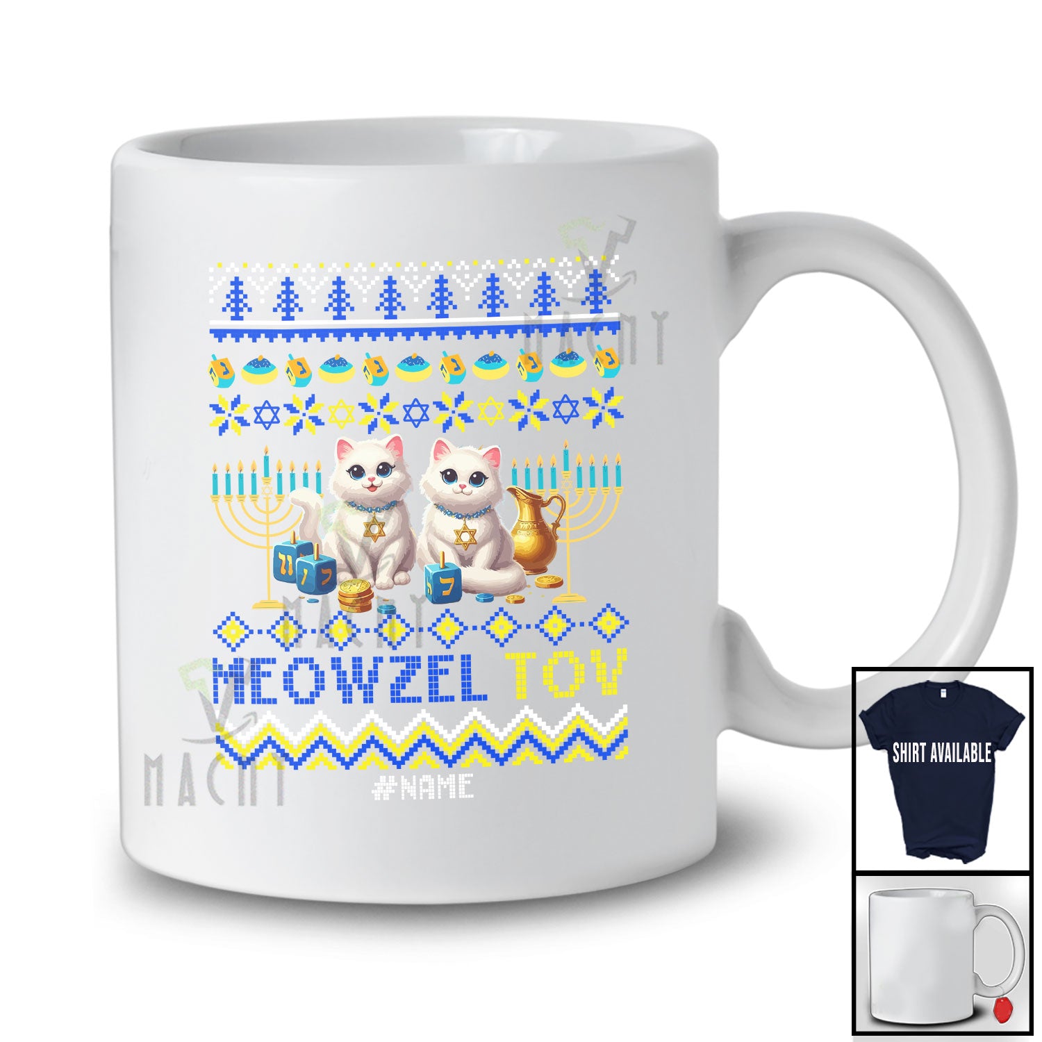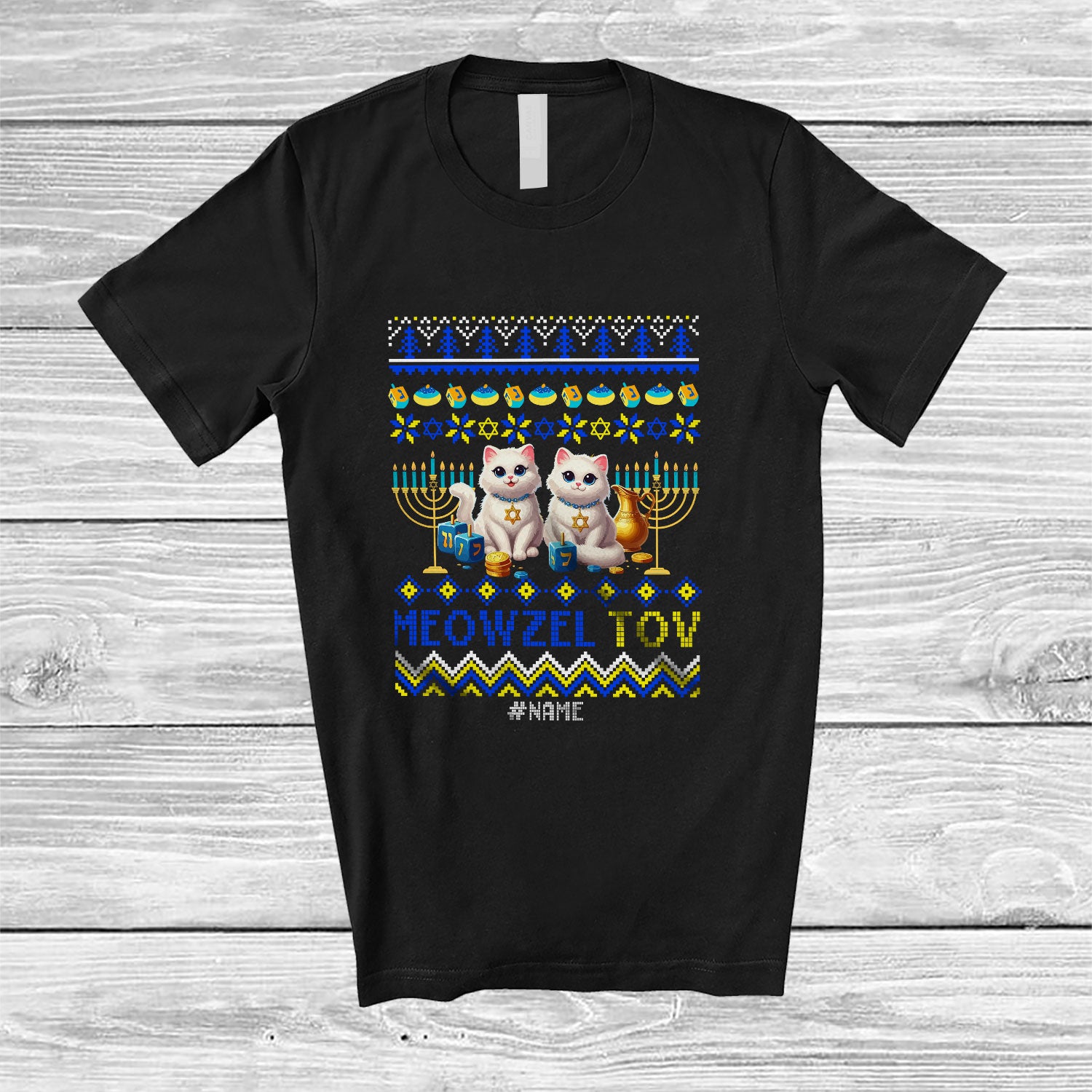• Personalized Custom Name Meowzel Tov; Lovely Hanukkah Sweater Menorah Two Cats Owner; Family T-Shirt. This cotton t-shirt is a durable staple product with a classic fit. One of the most popular items, it has a relaxed style made for everyday and casual wear.