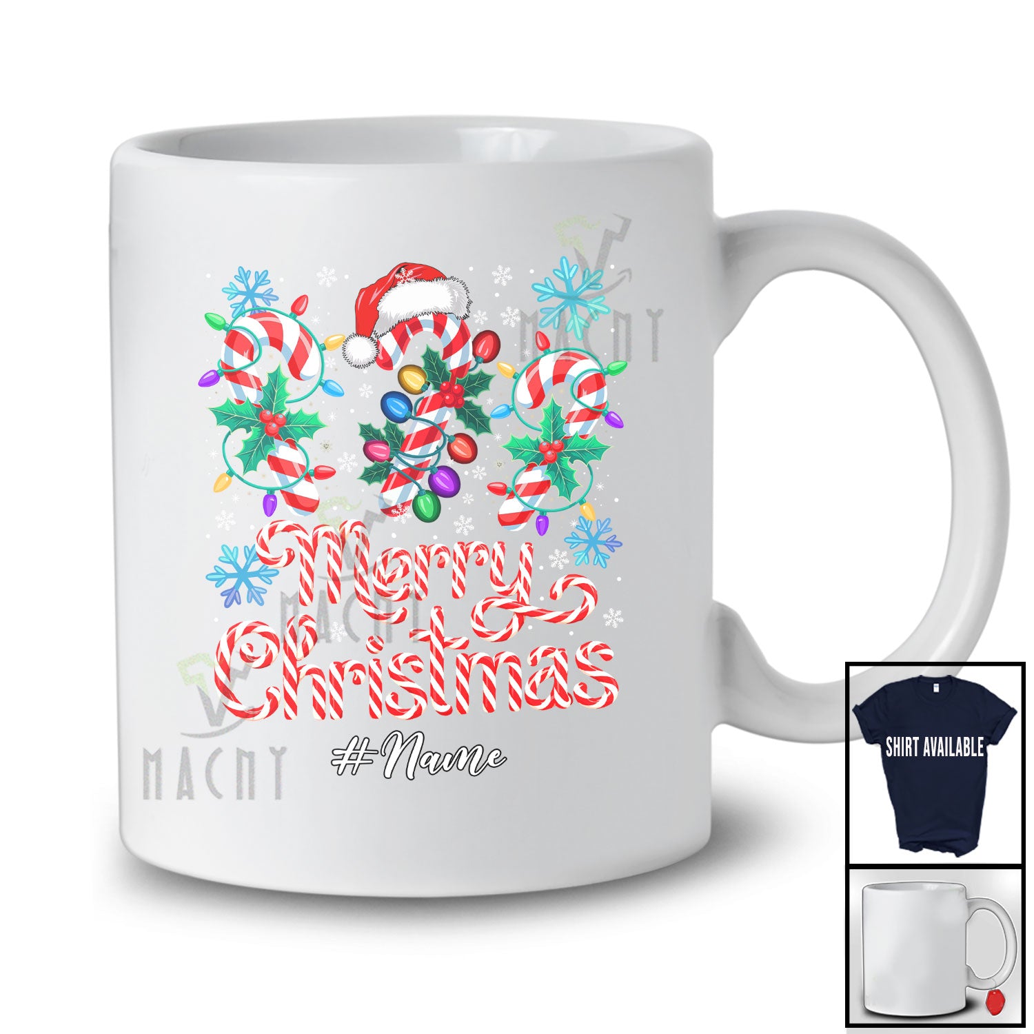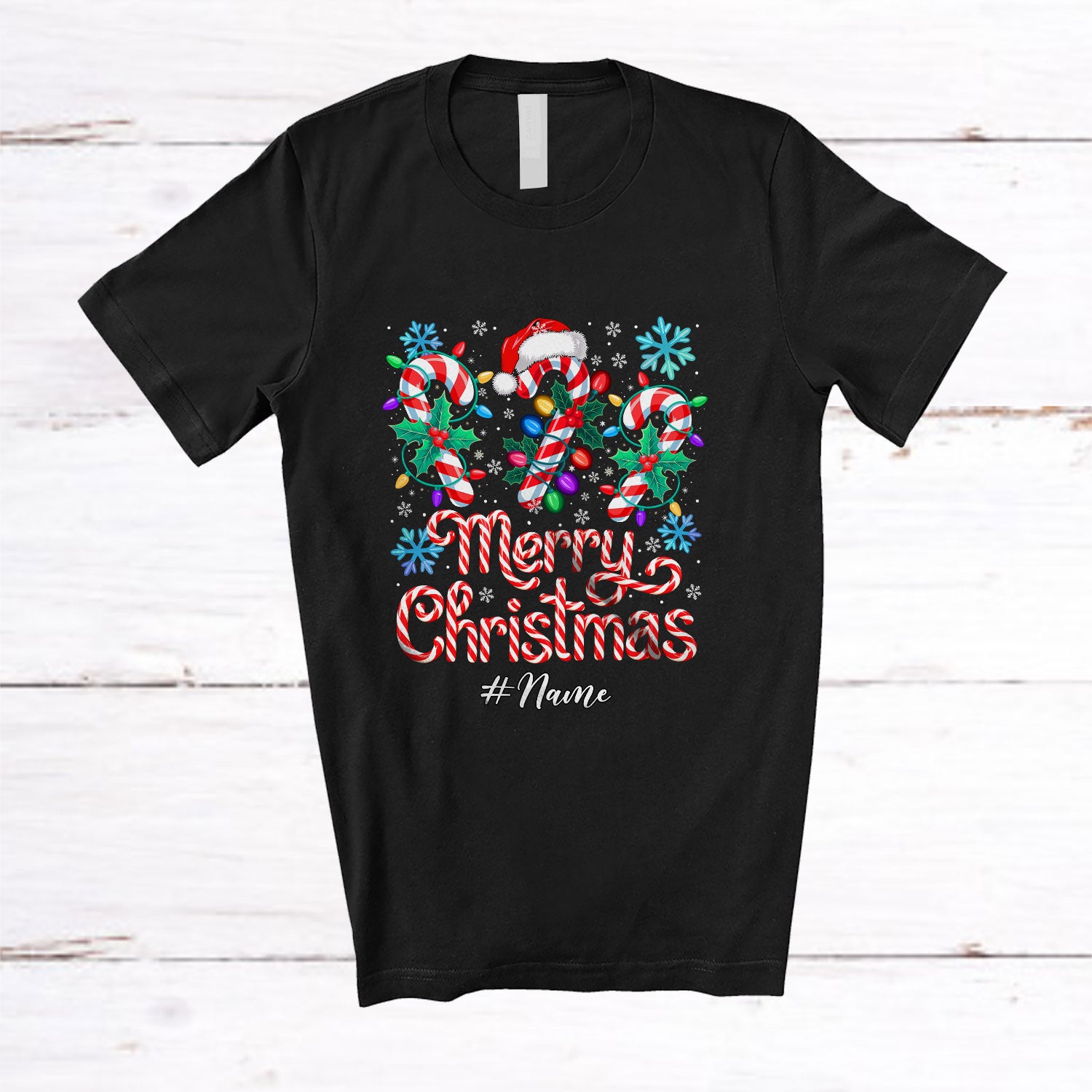 • Personalized Custom Name Merry Christmas; Amazing X-mas Lights Three Santa Candy Canes T-Shirt. This cotton t-shirt is a durable staple product with a classic fit. One of the most popular items, it has a relaxed style made for everyday and casual wear.