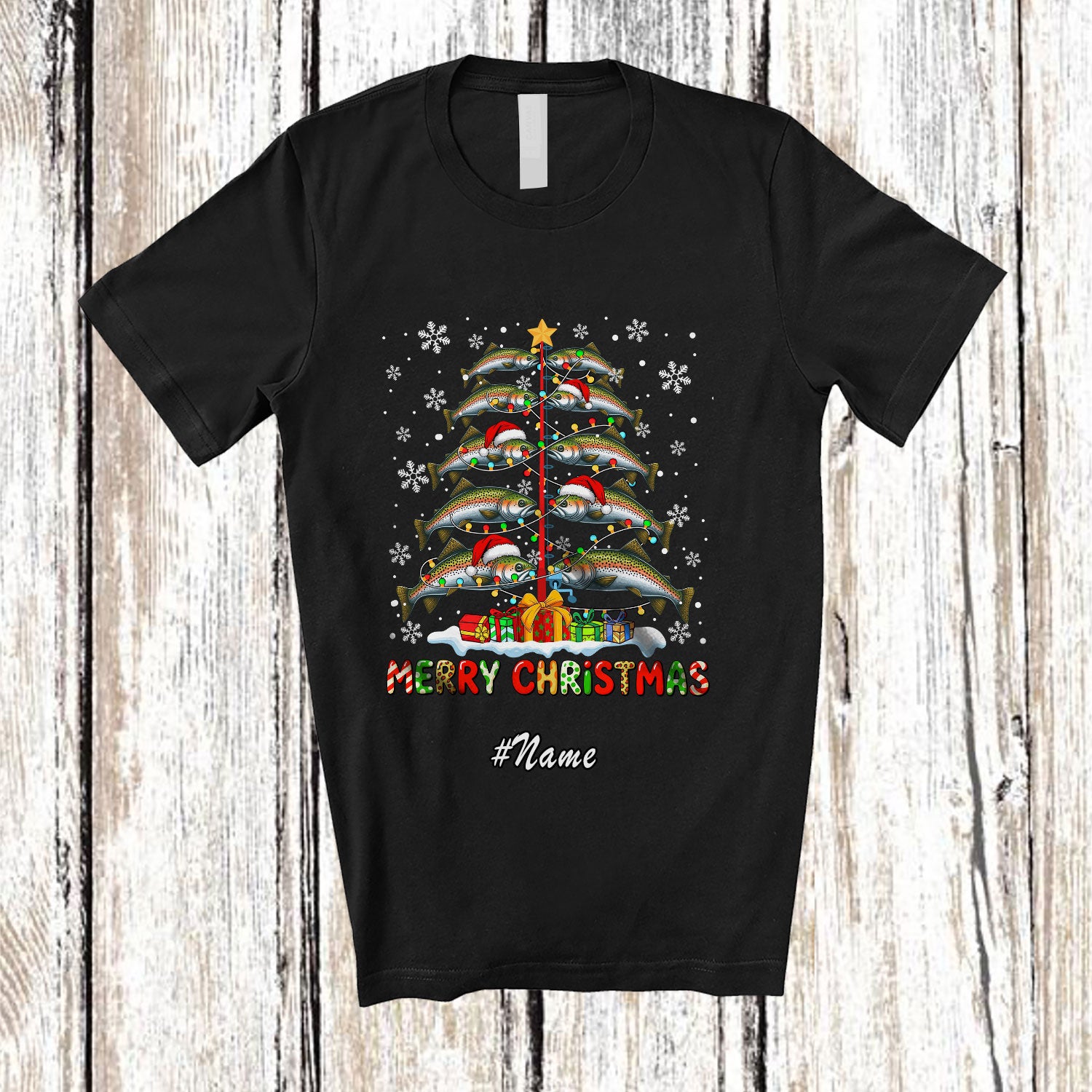• Personalized Custom Name Merry Christmas; Amazing X-mas Tree Lights Santa Trout Fish Fishing T-Shirt. This cotton t-shirt is a durable staple product with a classic fit. One of the most popular items, it has a relaxed style made for everyday and casual wear.
