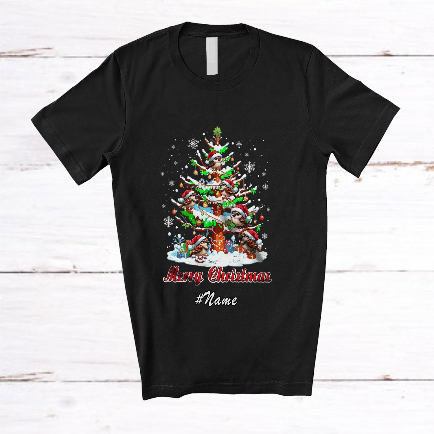 • Personalized Custom Name Merry Christmas; Lovely Sparrows On X-mas Tree; Bird Lover T-Shirt. This cotton t-shirt is a durable staple product with a classic fit. One of the most popular items, it has a relaxed style made for everyday and casual wear.