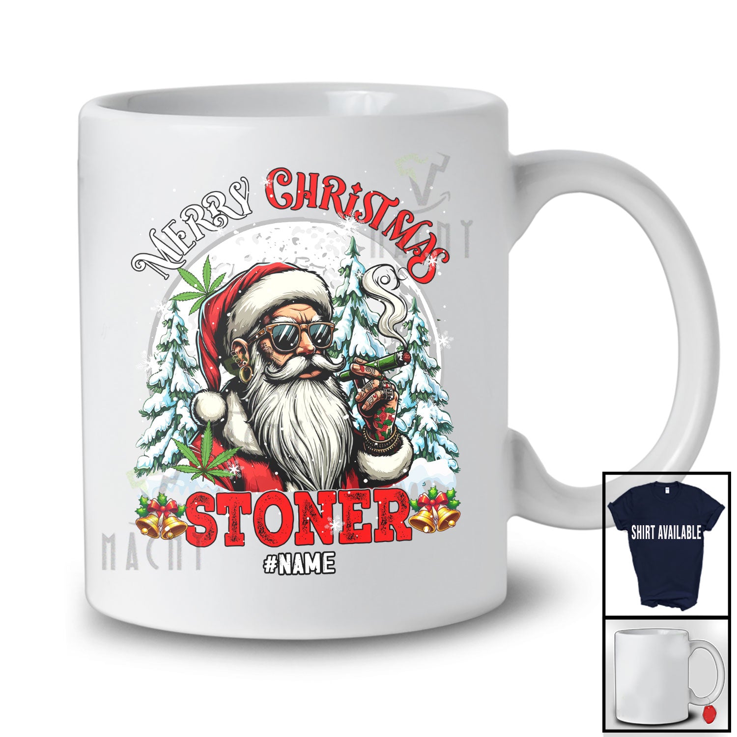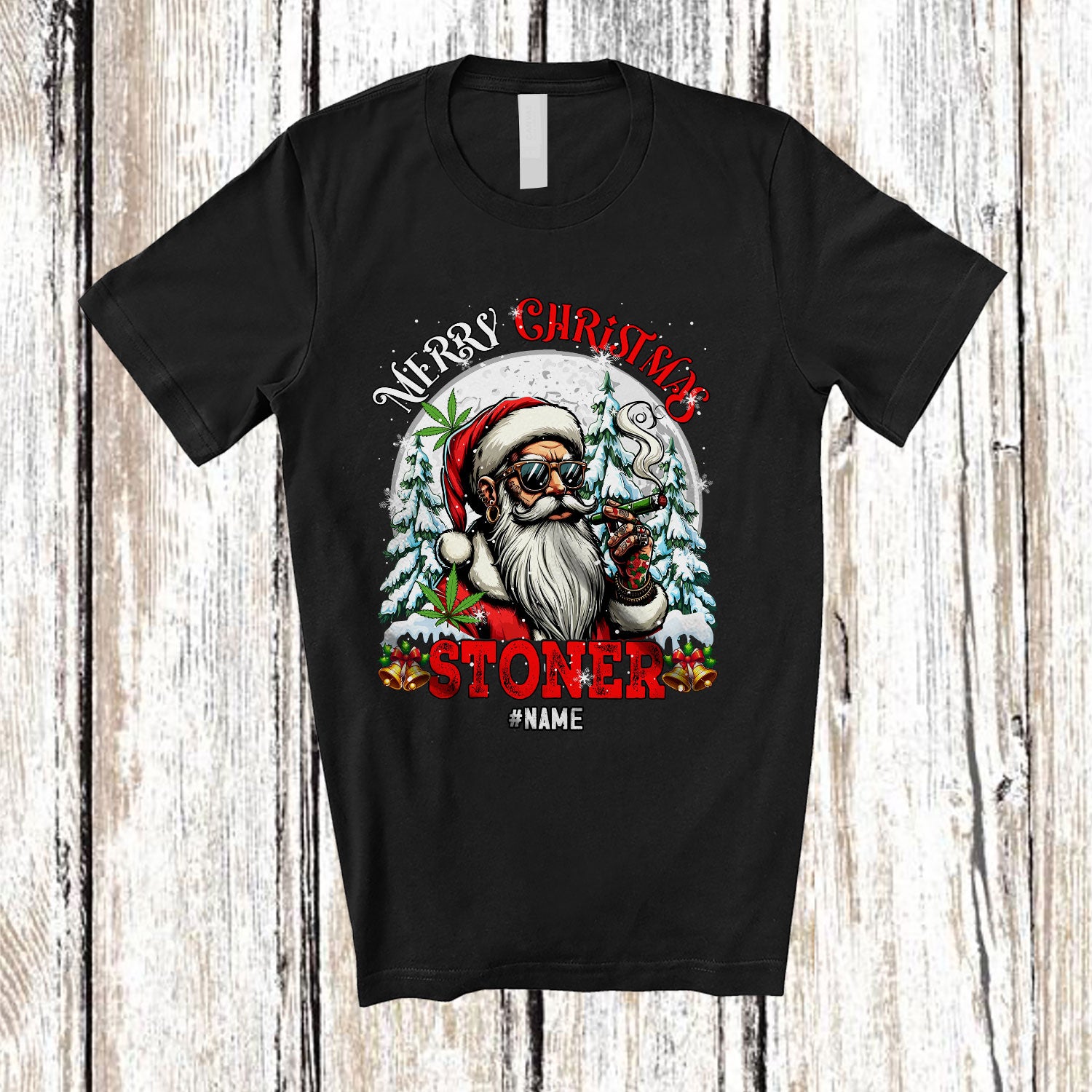 Personalized Custom Name Merry Christmas Stoner; Humorous Moon Santa Smoking; 420 Smoker T-Shirt. This cotton t-shirt is a durable staple product with a classic fit. One of the most popular items, it has a relaxed style made for everyday and casual wear.