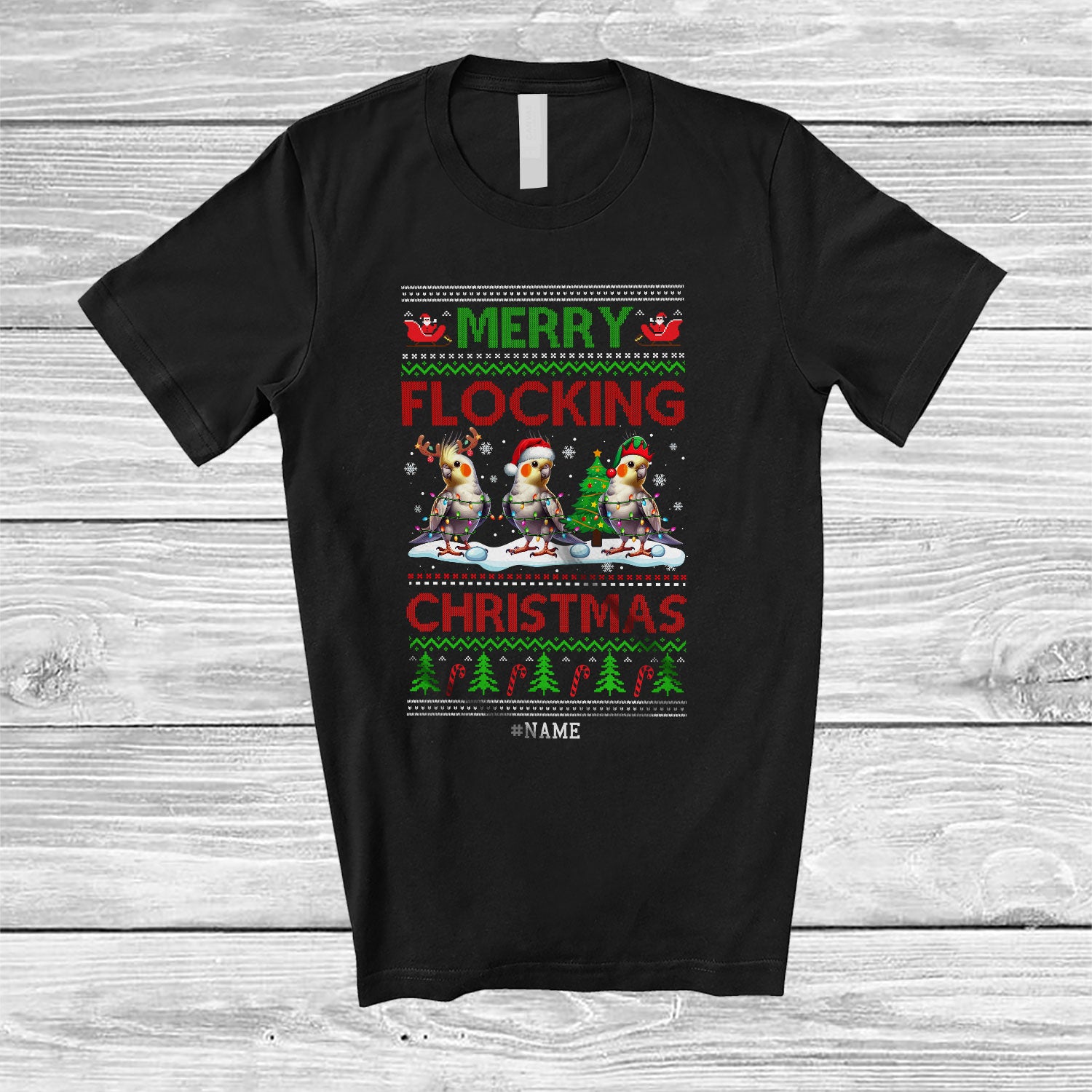 Personalized Custom Name Merry Flocking; Wonderful Christmas Sweater Three Cockatiel; Bird T-Shirt
