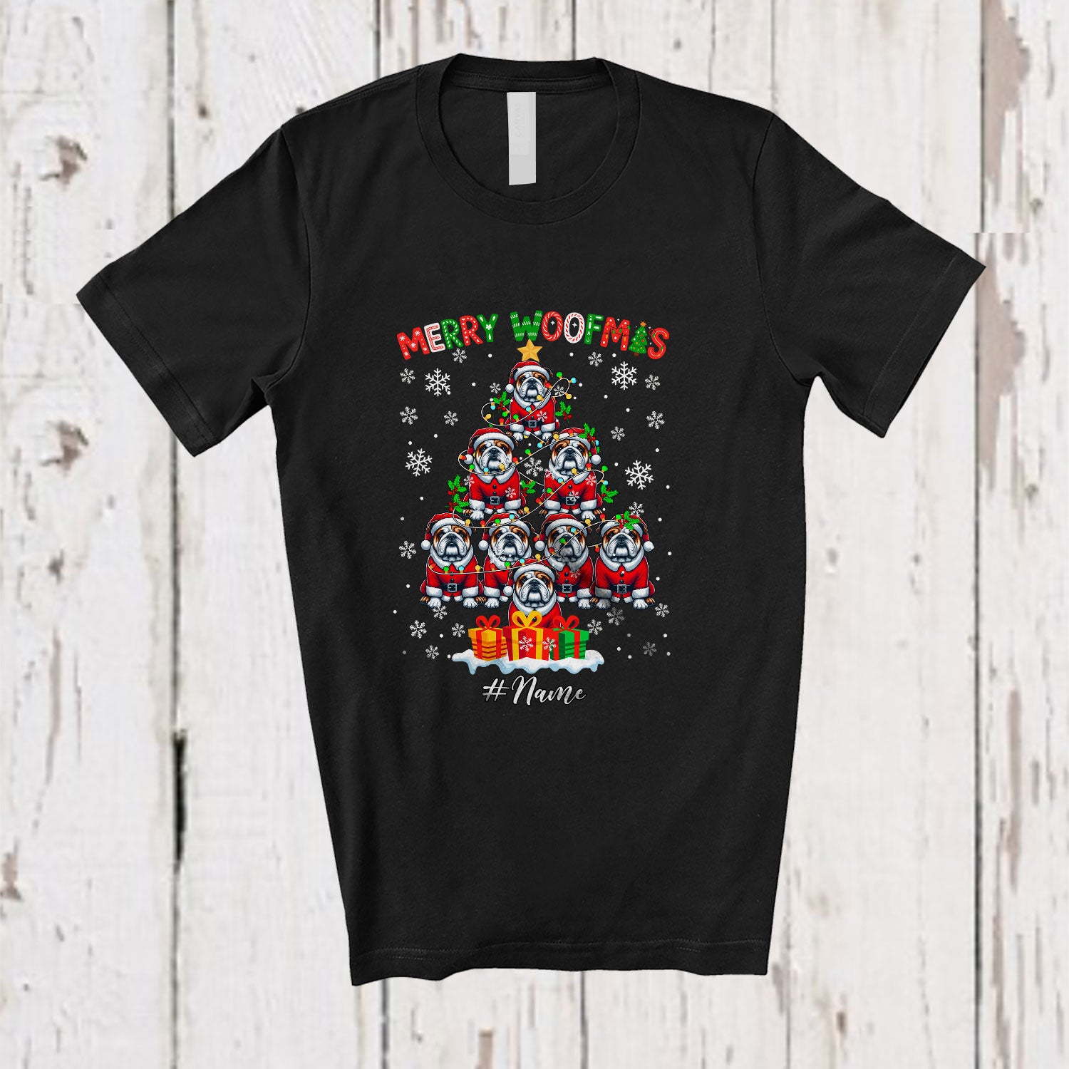 • Personalized Custom Name Merry Woofmas; Joyful Christmas Lights Santa Bulldog X-mas Tree T-Shirt. This cotton t-shirt is a durable staple product with a classic fit. One of the most popular items, it has a relaxed style made for everyday and casual wear.