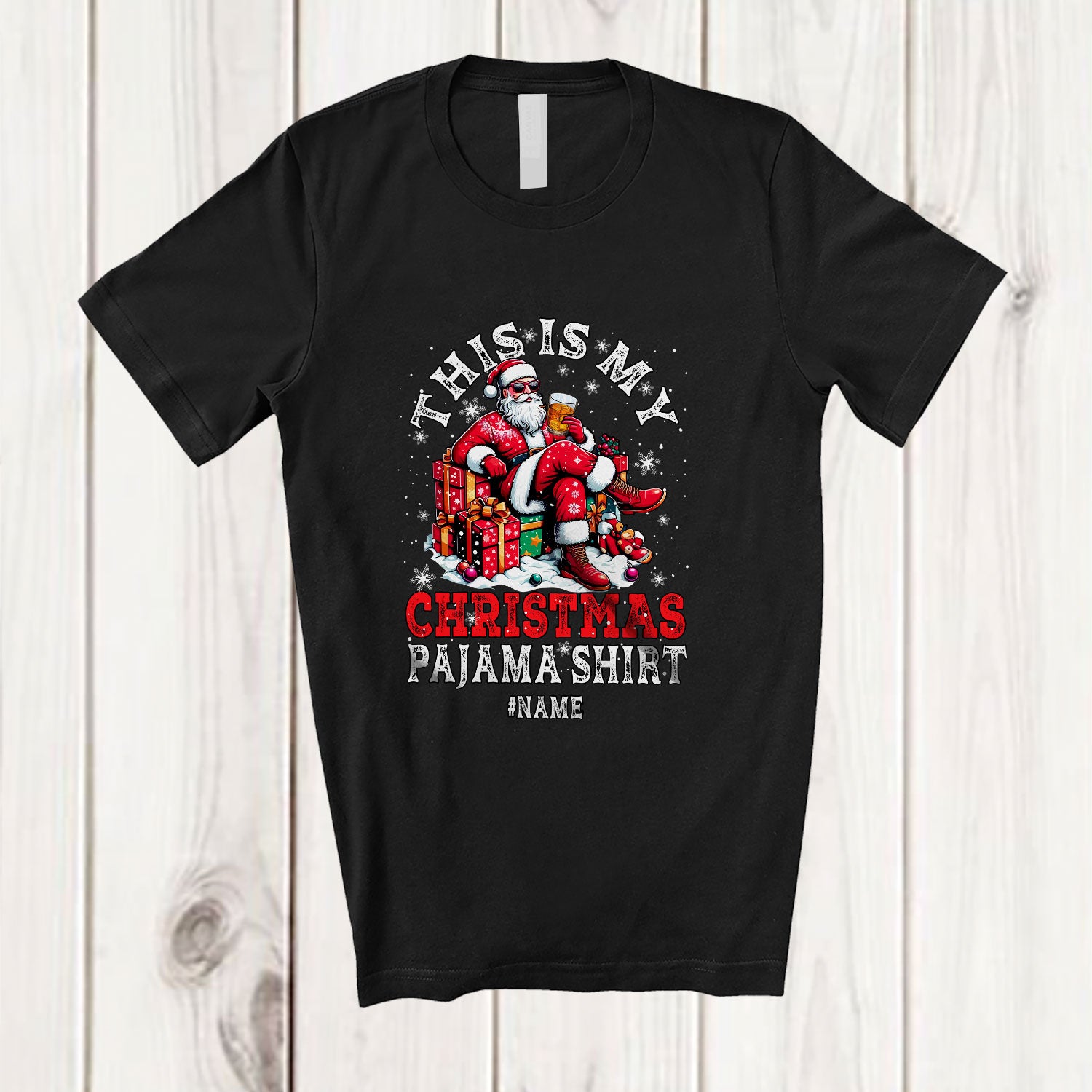 • Personalized Custom Name My Christmas Pajama Shirt; Cheerful X-mas Santa Drinking Bourbon T-Shirt. This cotton t-shirt is a durable staple product with a classic fit. One of the most popular items, it has a relaxed style made for everyday and casual wear.