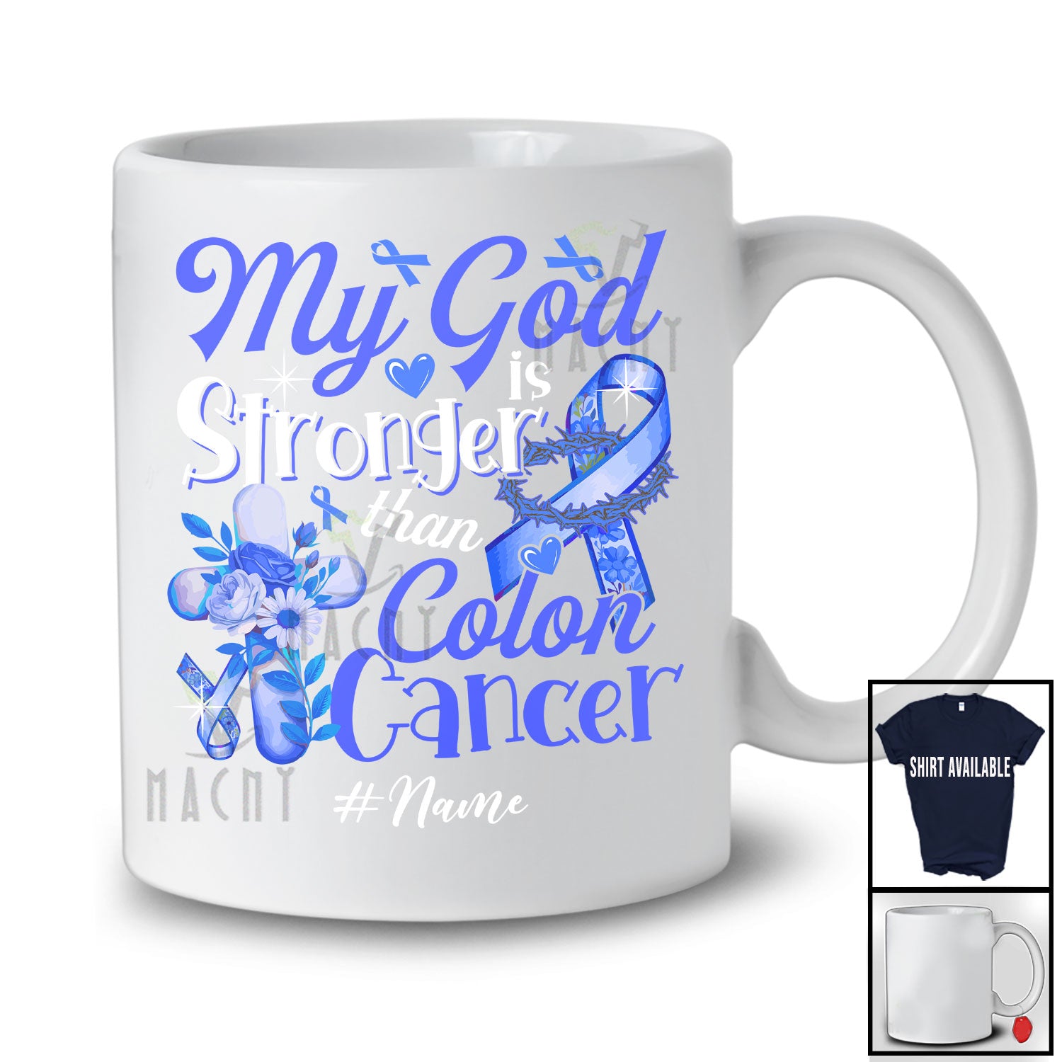The Personalized Custom Name My God Is Stronger Than Colon Cancer; Proud Awareness Blue Ribbon T-Shirt is far and away, one of our most popular items. People can't seem to get enough of it.
