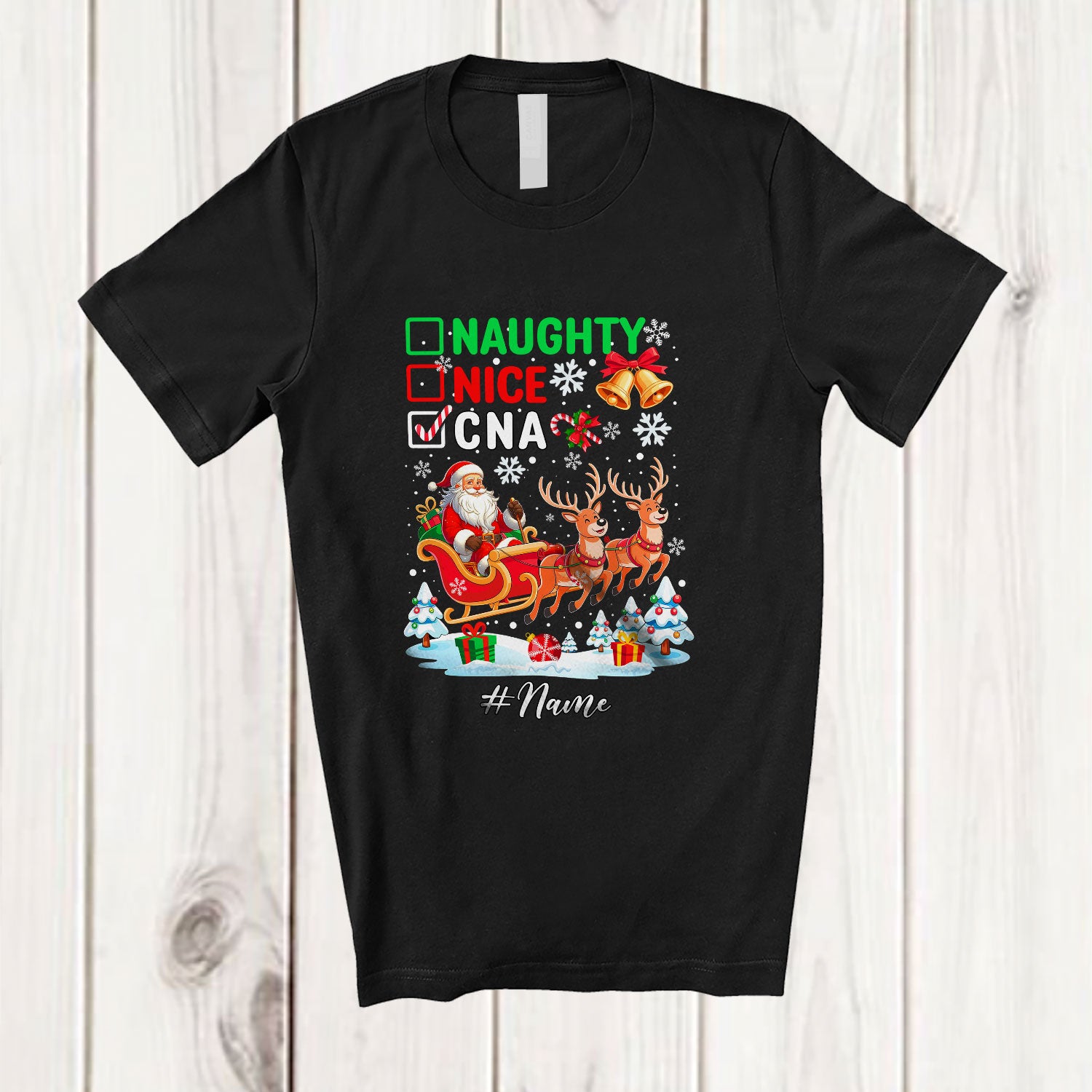 Personalized Custom Name Naughty Nice CNA; Amazing Christmas Santa Sleigh Reindeer; Nurse T-Shirt