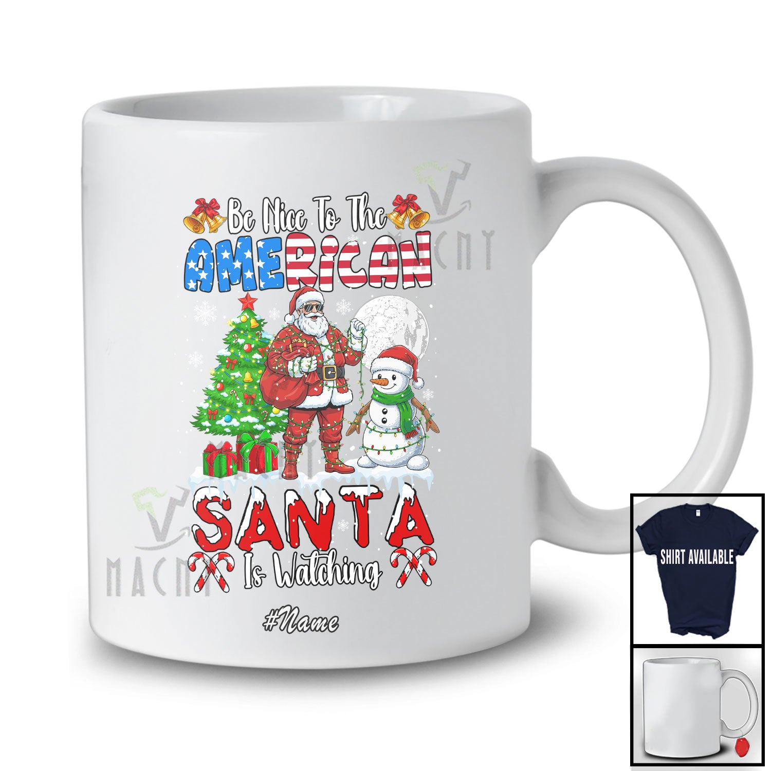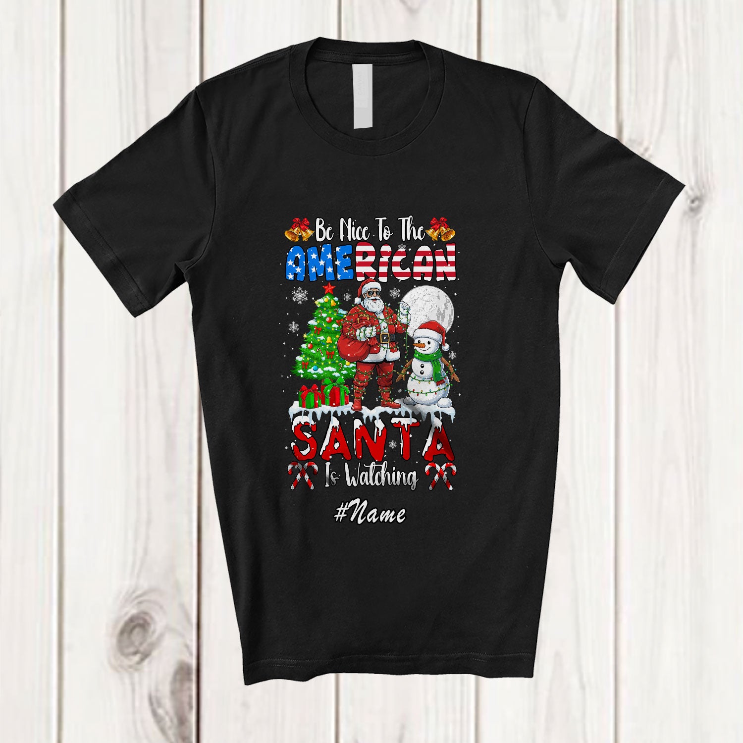 Personalized Custom Name Nice To The American; Amazing Christmas Tree Santa Snowman T-Shirt. This cotton t-shirt is a durable staple product with a classic fit. One of the most popular items, it has a relaxed style made for everyday and casual wear.