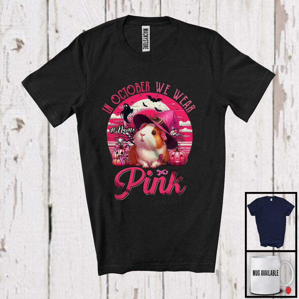 Personalized Custom Name October We Wear Pink; Lovely Breast Cancer Halloween Guinea Pig Witch T-Shirt