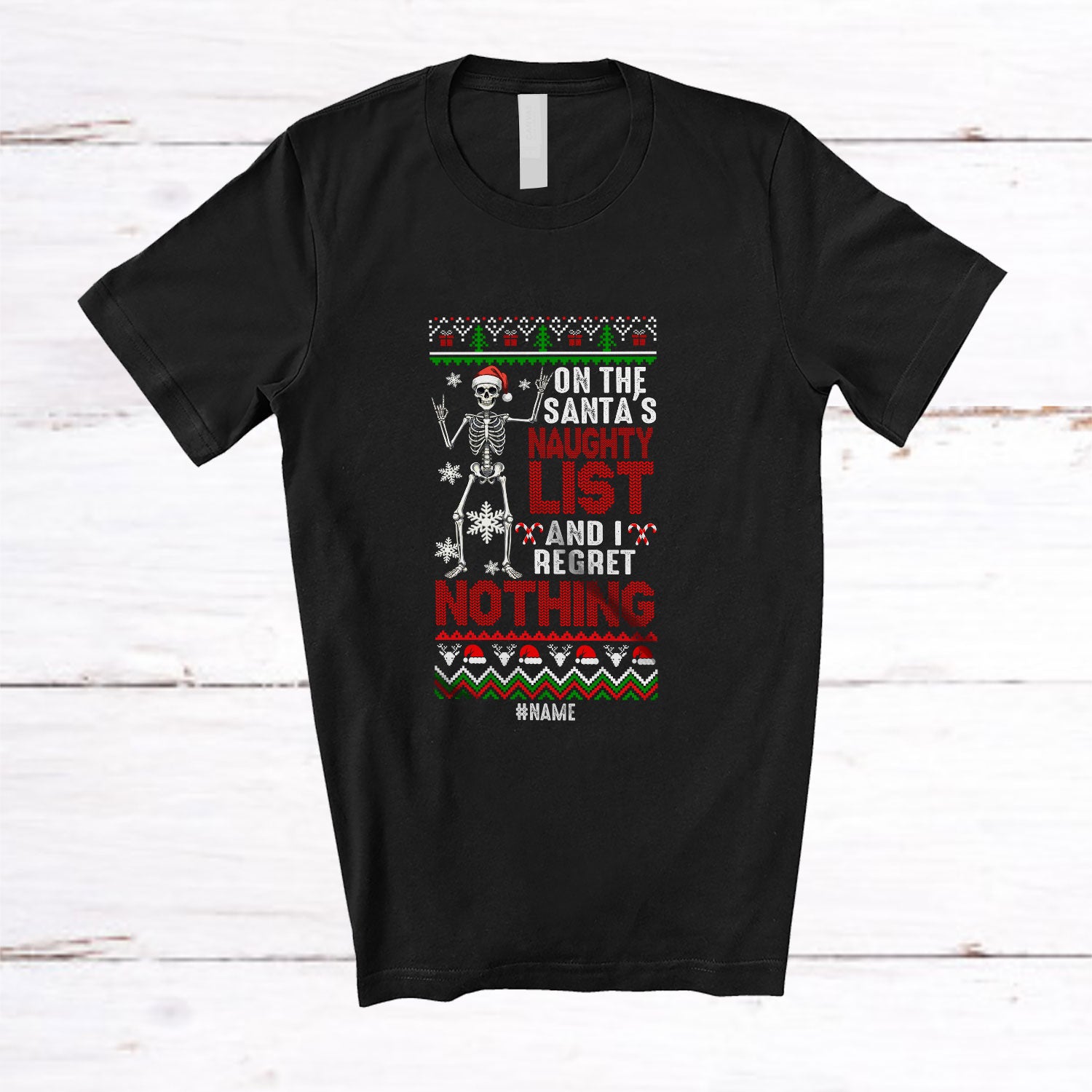 • Personalized Custom Name On The Santa's Naughty List; Scary Christmas Skeleton Sweater T-Shirt. This cotton t-shirt is a durable staple product with a classic fit. One of the most popular items, it has a relaxed style made for everyday and casual wear.