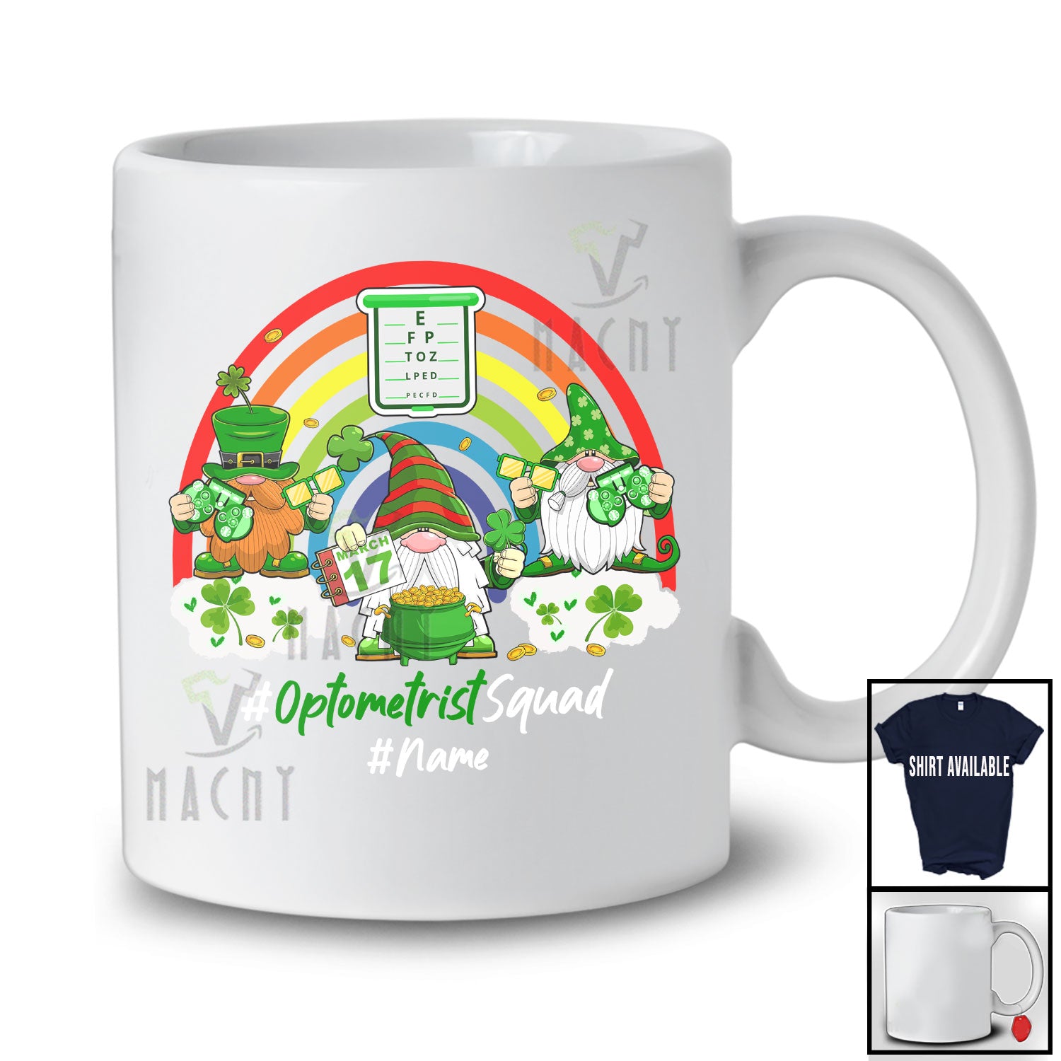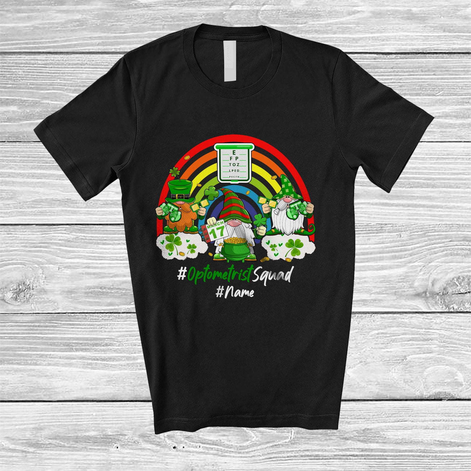 Personalized Custom Name Optometrist Squad; Joyful St. Patrick's Day Three Gnomes; Rainbow T-Shirt. This cotton t-shirt is a durable staple product with a classic fit. One of the most popular items, it has a relaxed style made for everyday and casual wear.