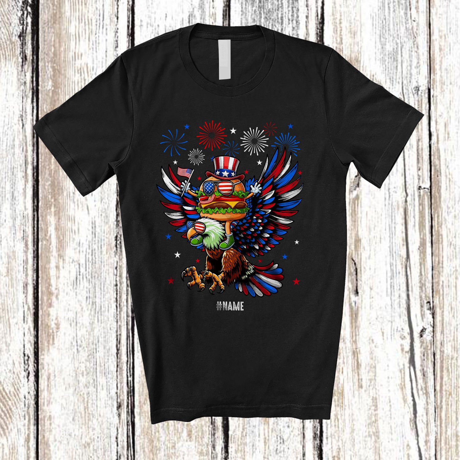 Personalized Custom Name Patriotic Squad; Joyful 4th Of July Hamburger Riding Eagle Food Lover T-Shirt. This cotton t-shirt is a durable staple product with a classic fit. One of the most popular items, it has a relaxed style made for everyday and casual wear.