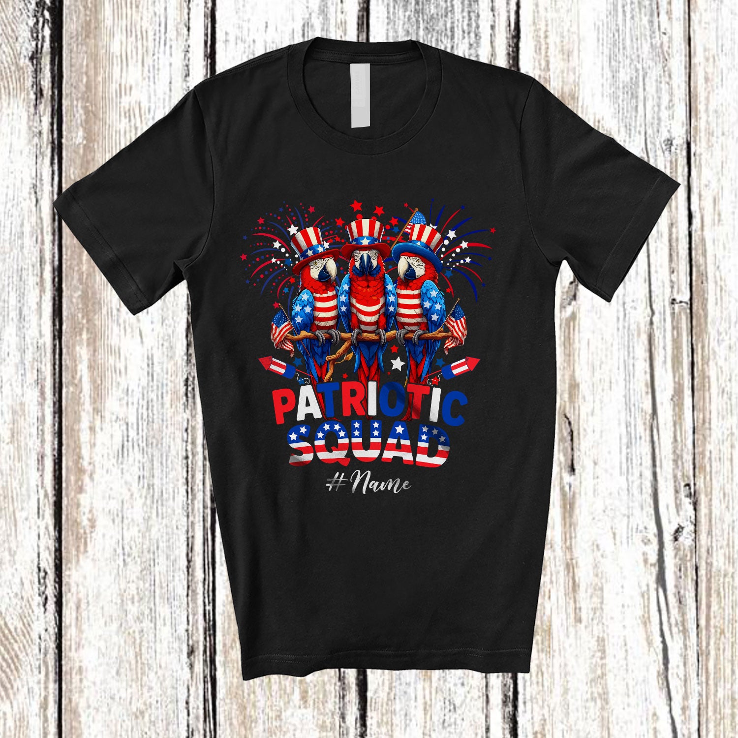 • Personalized Custom Name Patriotic Squad; Proud 4th Of July Three US Flag Cute Macaws T-Shirt. This cotton t-shirt is a durable staple product with a classic fit. One of the most popular items, it has a relaxed style made for everyday and casual wear.