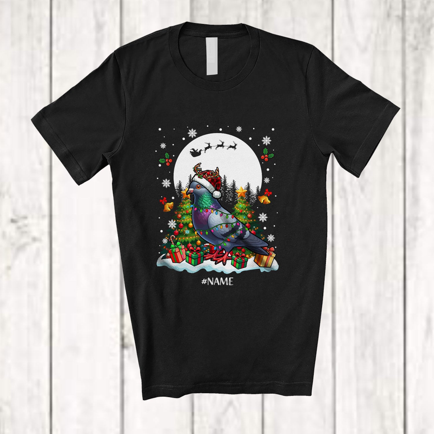 • Personalized Custom Name Pigeon Plaid Santa Reindeer; Lovely Christmas Tree Lights Moon Bird T-Shirt. This cotton t-shirt is a durable staple product with a classic fit. One of the most popular items, it has a relaxed style made for everyday and casual wear.