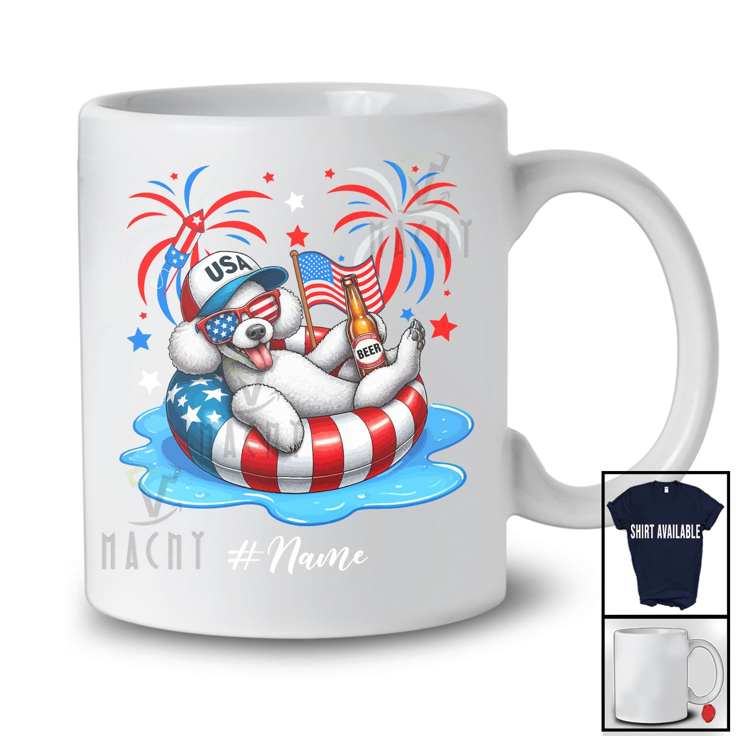 Personalized Custom Name Poodle Drinking On Float Beach; Joyful 4th Of July Patriotic T-Shirt. This cotton t-shirt is a durable staple product with a classic fit. One of the most popular items, it has a relaxed style made for everyday and casual wear.