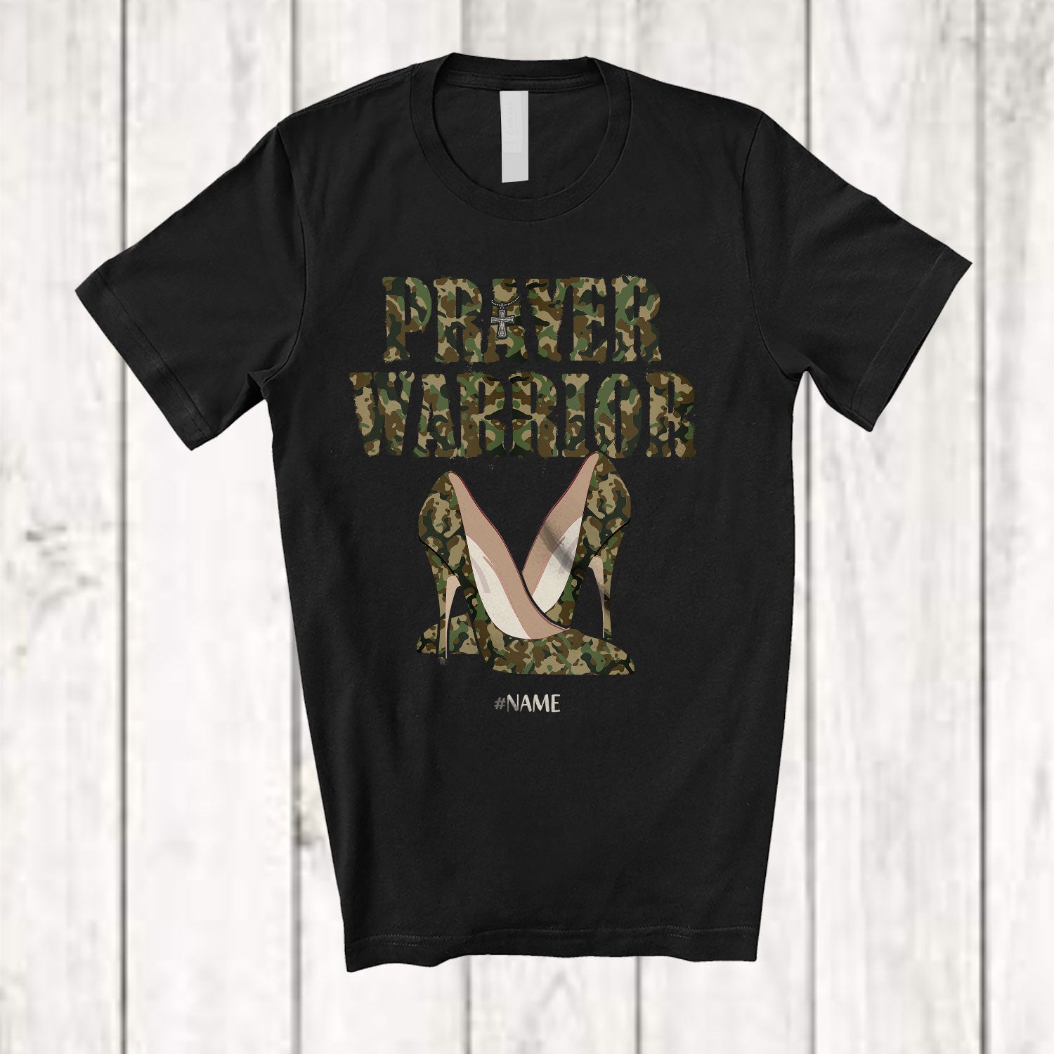 Personalized Custom Name Prayer Warrior; Proud Veteran High Heels Soldier Army; Family Group T-Shirt. This cotton t-shirt is a durable staple product with a classic fit. One of the most popular items, it has a relaxed style made for everyday and casual wear.