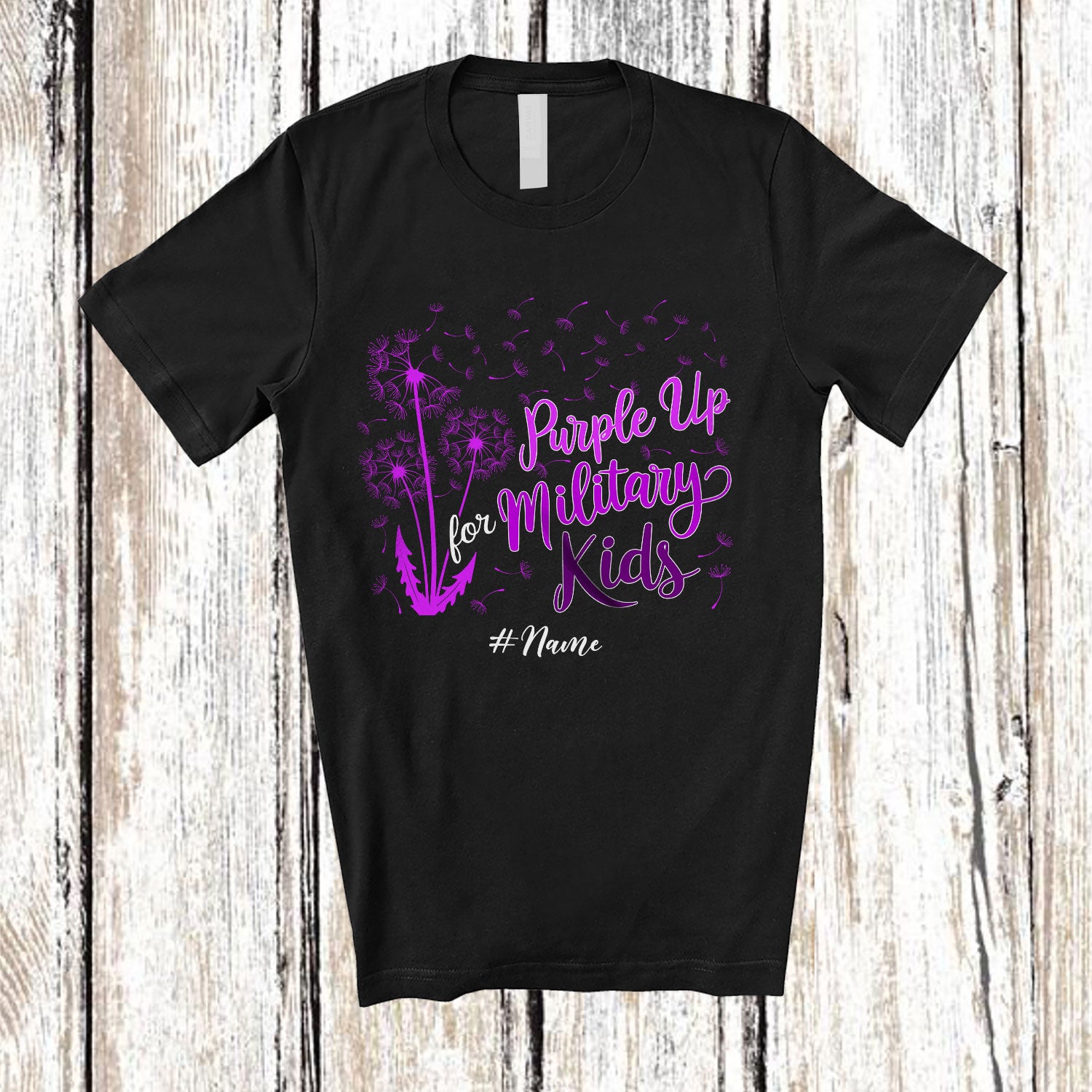 Personalized Custom Name Purple Up For Military Kids; Lovely Military Child Month Dandelion T-Shirt. This cotton t-shirt is a durable staple product with a classic fit. One of the most popular items, it has a relaxed style made for everyday and casual wear.