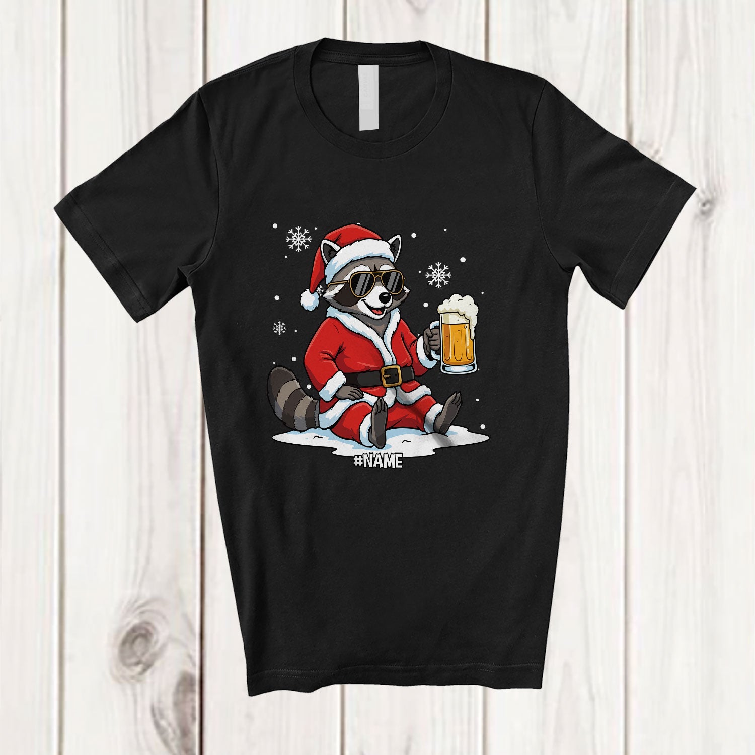 Personalized Custom Name Raccoon Santa Sunglasses Drinking Beer; Joyful Christmas Drunker T-Shirt