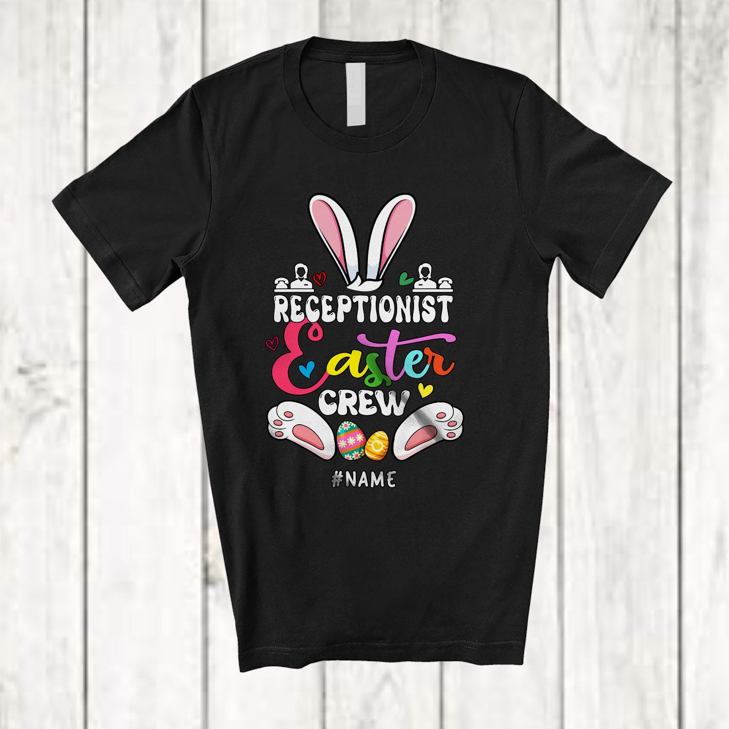 Personalized Custom Name Receptionist Easter Crew; Adorable Easter Bunny Ears; Family T-Shirt. This cotton t-shirt is a durable staple product with a classic fit. One of the most popular items, it has a relaxed style made for everyday and casual wear.