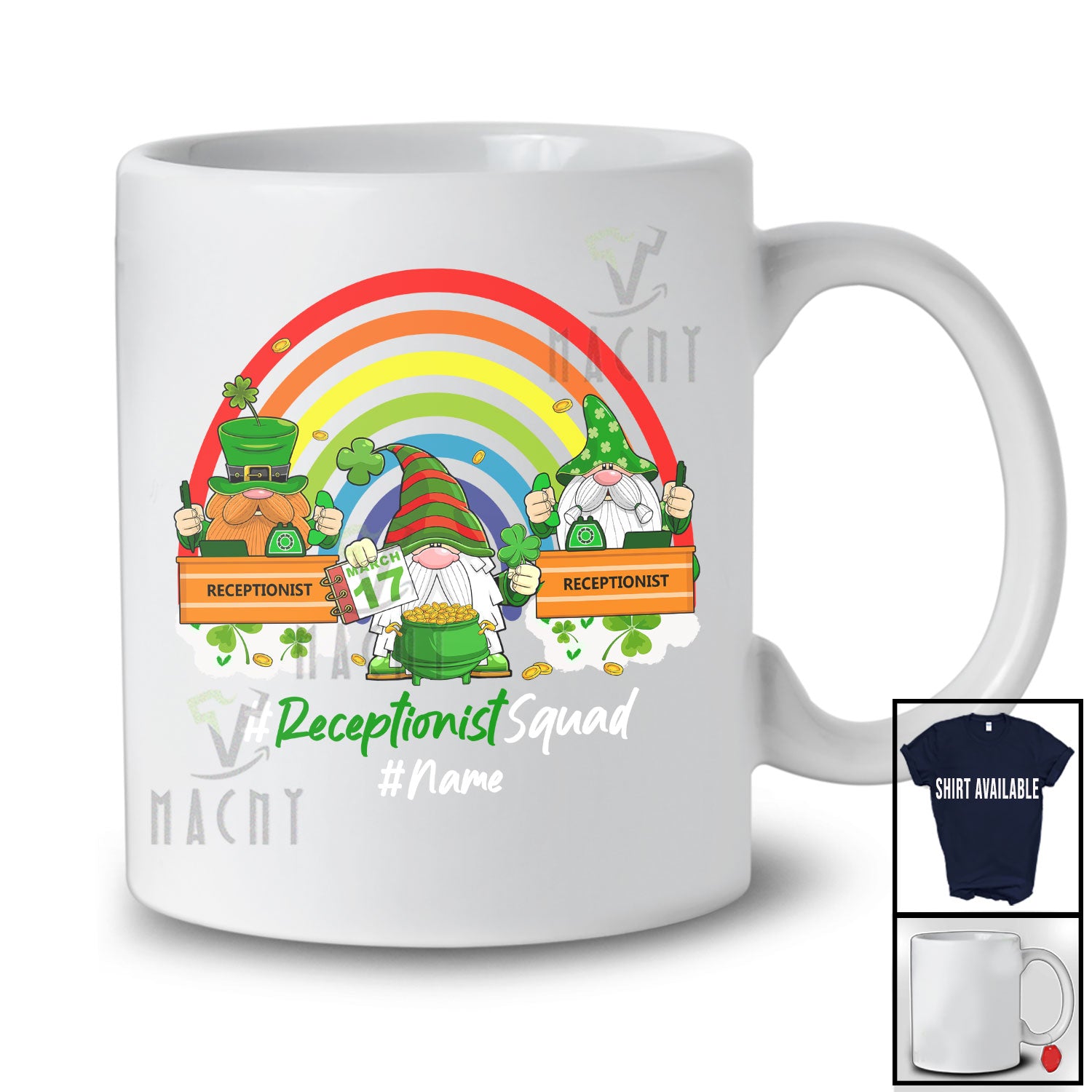 • Personalized Custom Name Receptionist Squad; Joyful St. Patrick's Day Three Gnomes; Rainbow T-Shirt. This cotton t-shirt is a durable staple product with a classic fit. One of the most popular items, it has a relaxed style made for everyday and casual wear.