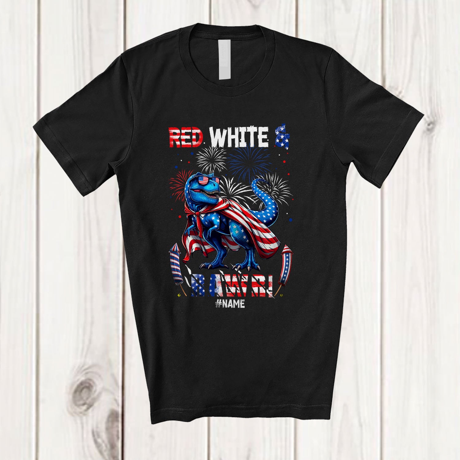 Personalized Custom Name Red White Rawr; Humorous 4th Of July US Flag T-Rex Fireworks; Patriotic T-Shirt