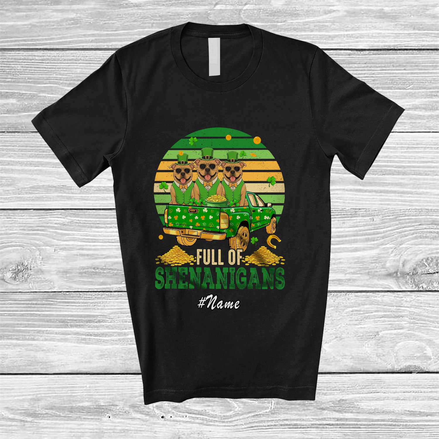 Personalized Custom Name Retro Full Shenanigans; Joyful St. Patrick's Day Three Pit Bull Truck T-Shirt. This cotton t-shirt is a durable staple product with a classic fit. One of the most popular items, it has a relaxed style made for everyday and casual wear.