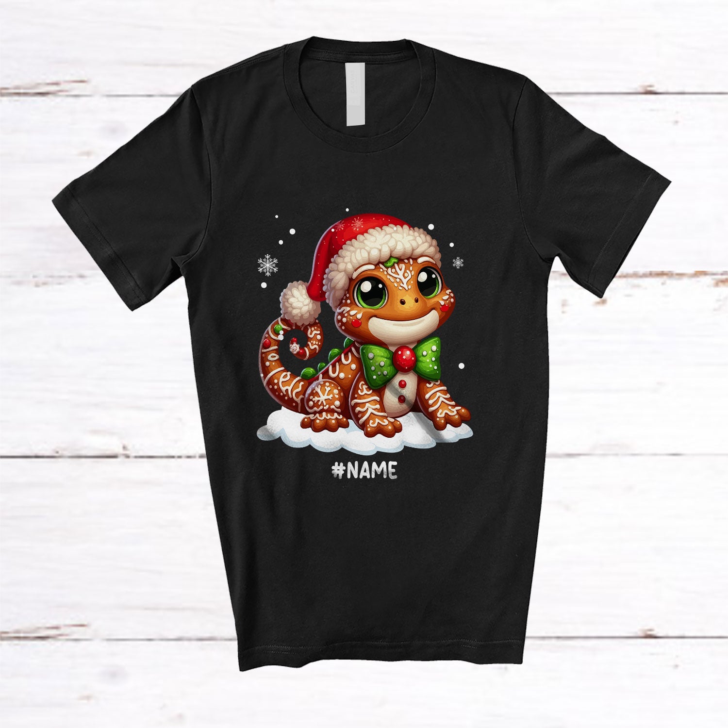 • Personalized Custom Name Santa Gingerbread Lizard; Amazing Christmas Snowing Animal Lover T-Shirt. This cotton t-shirt is a durable staple product with a classic fit. One of the most popular items, it has a relaxed style made for everyday and casual wear.