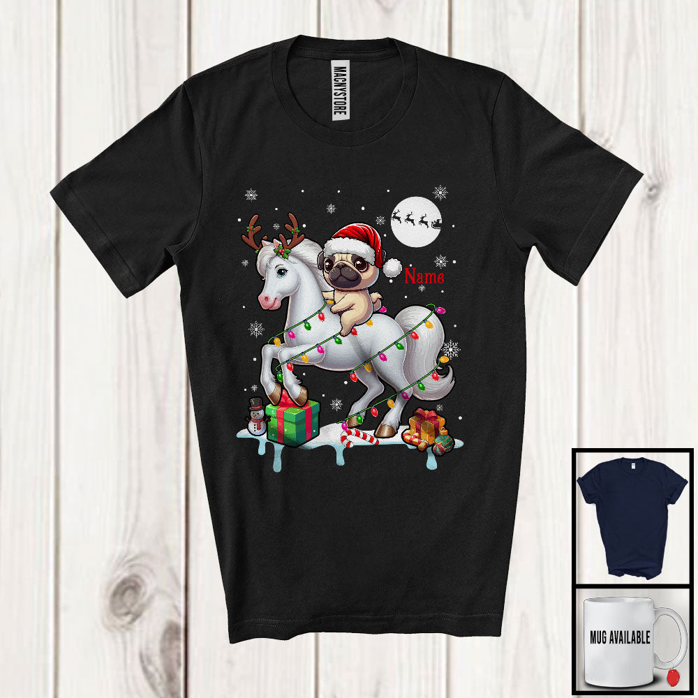 Personalized Custom Name Santa Pug Riding Reindeer Horse; Adorable Christmas Lights Snow T-Shirt