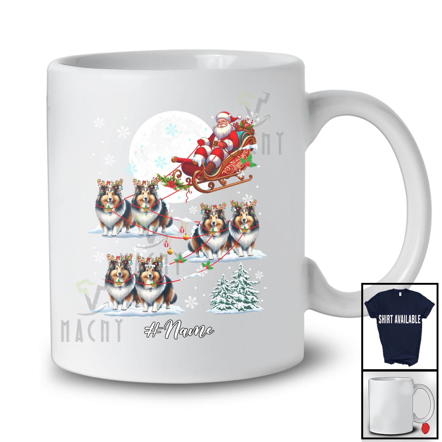 • Personalized Custom Name Santa Sleigh Shelties Reindeer; Lovely Christmas Snow Moon T-Shirt. This cotton t-shirt is a durable staple product with a classic fit. One of the most popular items, it has a relaxed style made for everyday and casual wear.