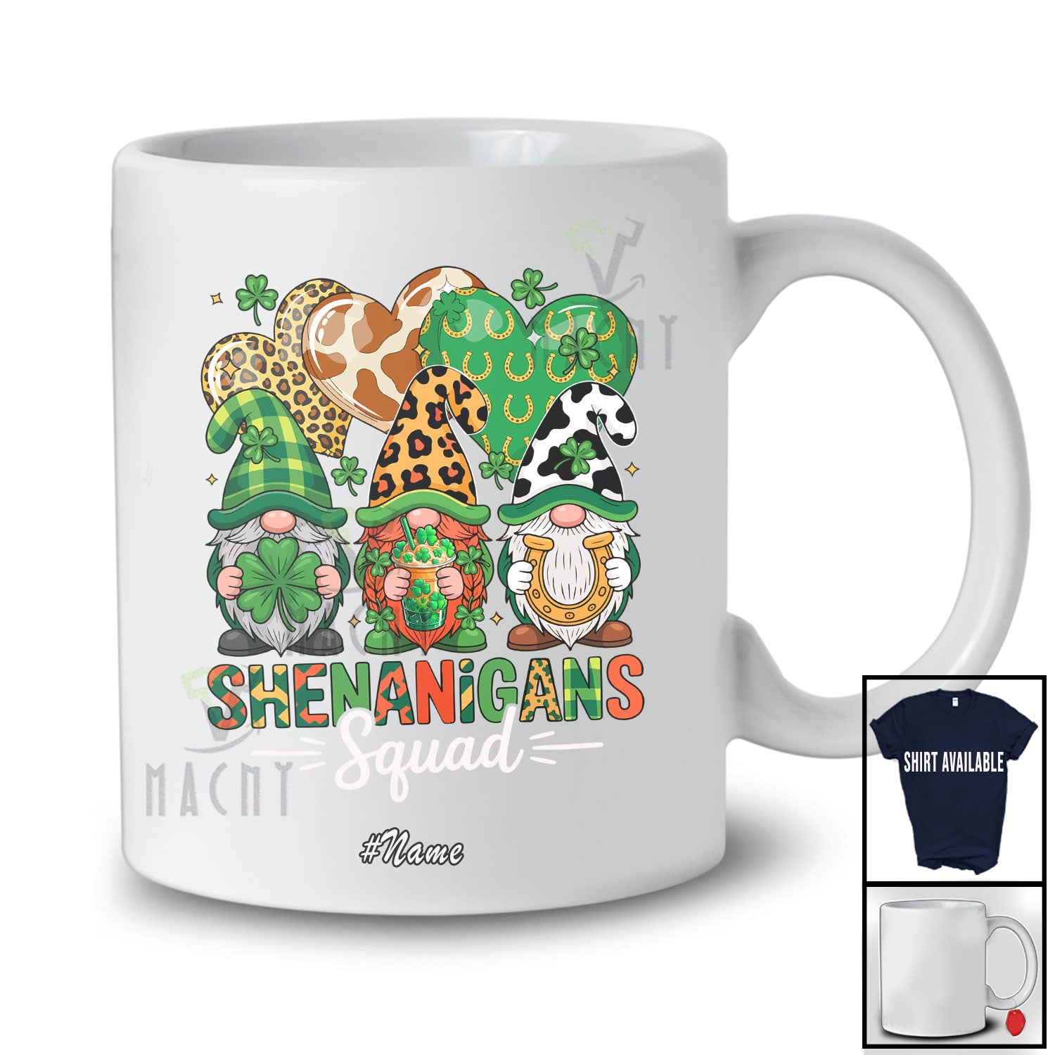 Personalized Custom Name Shenanigans Squad; Lovely St. Patrick's Day Three Leopard Gnomes Drinking Coffee T-Shirt. This cotton t-shirt is a durable staple product with a classic fit. One of the most popular items, it has a relaxed style made for everyday and casual wear.