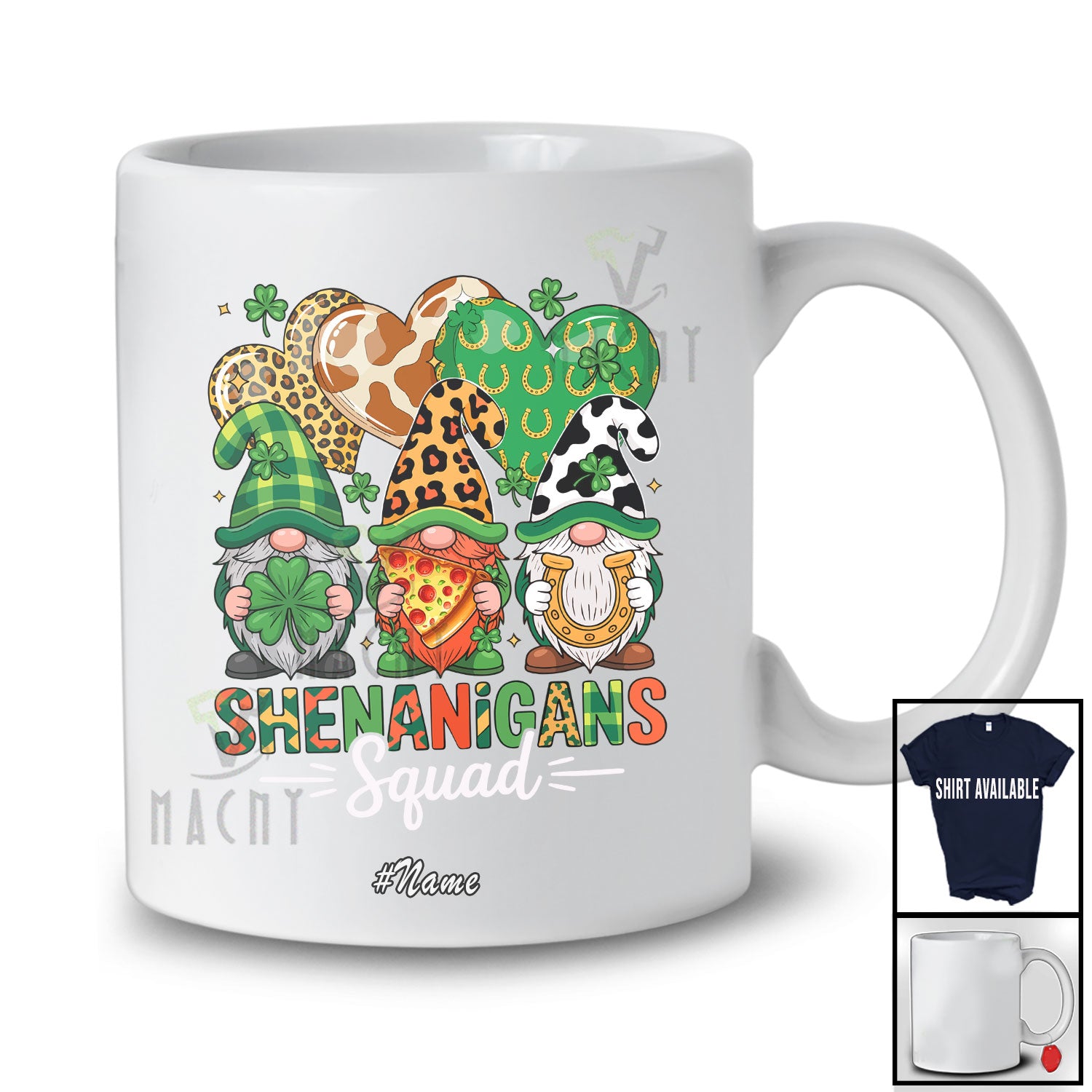 Personalized Custom Name Shenanigans Squad; Lovely St. Patrick's Day Three Leopard Gnomes Pizza T-Shirt. This cotton t-shirt is a durable staple product with a classic fit. One of the most popular items, it has a relaxed style made for everyday and casual wear.