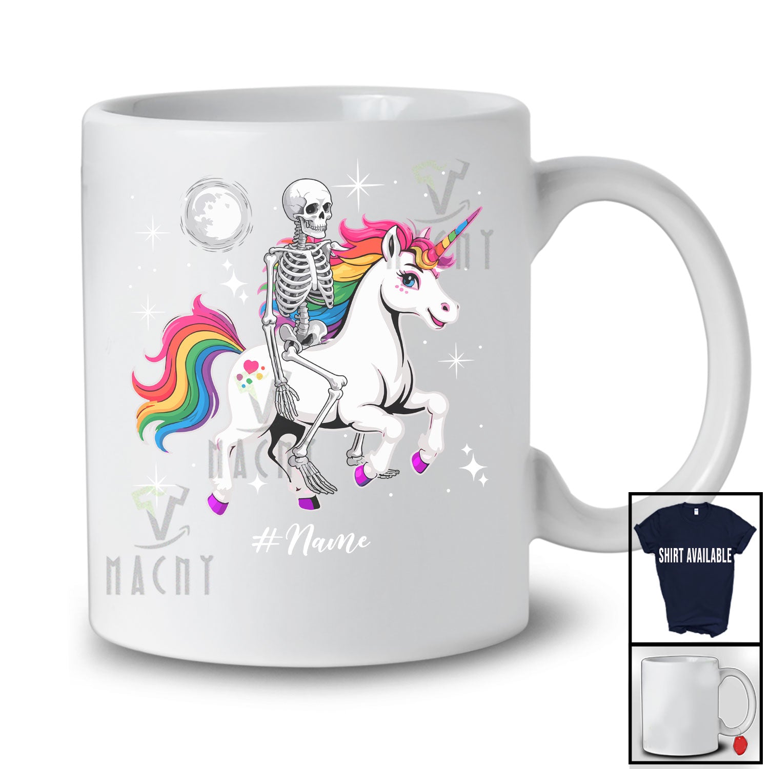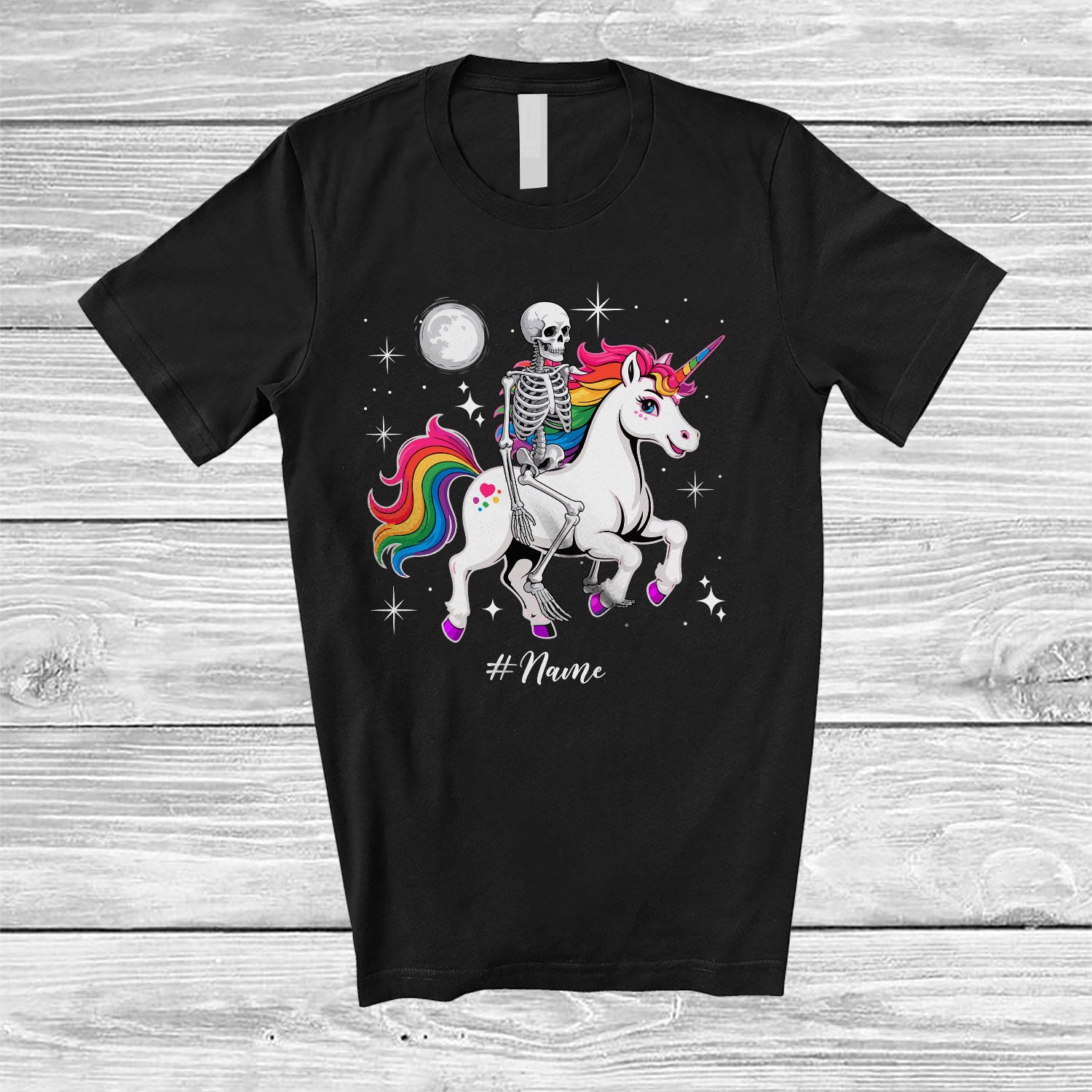 • Personalized Custom Name Skeleton Riding Unicorn; Humorous Halloween Skeleton Skull Unicorn T-Shirt. This cotton t-shirt is a durable staple product with a classic fit. One of the most popular items, it has a relaxed style made for everyday and casual wear.