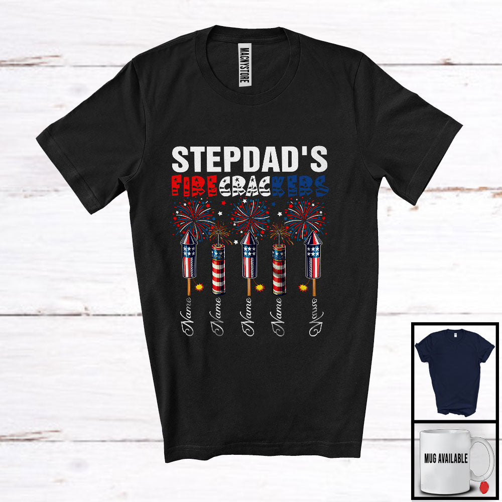 • Personalized Custom Name Stepdad's Firecrackers, Amazing 4th Of July Fireworks, Patriotic Family T-Shirt. This cotton t-shirt is a durable staple product with a classic fit. One of the most popular items, it has a relaxed style made for everyday and casual wear.