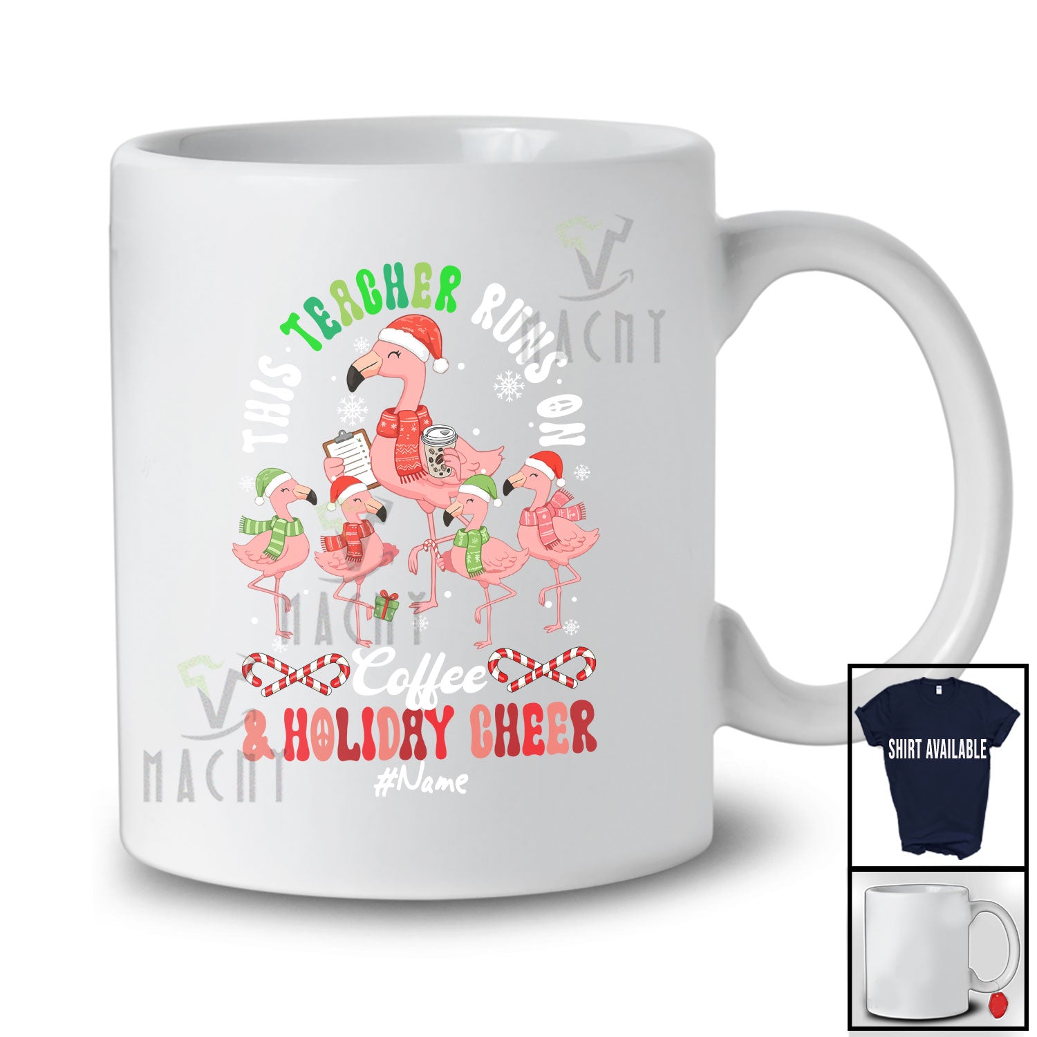 • Personalized Custom Name Teacher Runs On Coffee Holiday Cheer; Joyful Christmas Flamingo Classroom T-Shirt. This cotton t-shirt is a durable staple product with a classic fit. One of the most popular items, it has a relaxed style made for everyday and casual wear.