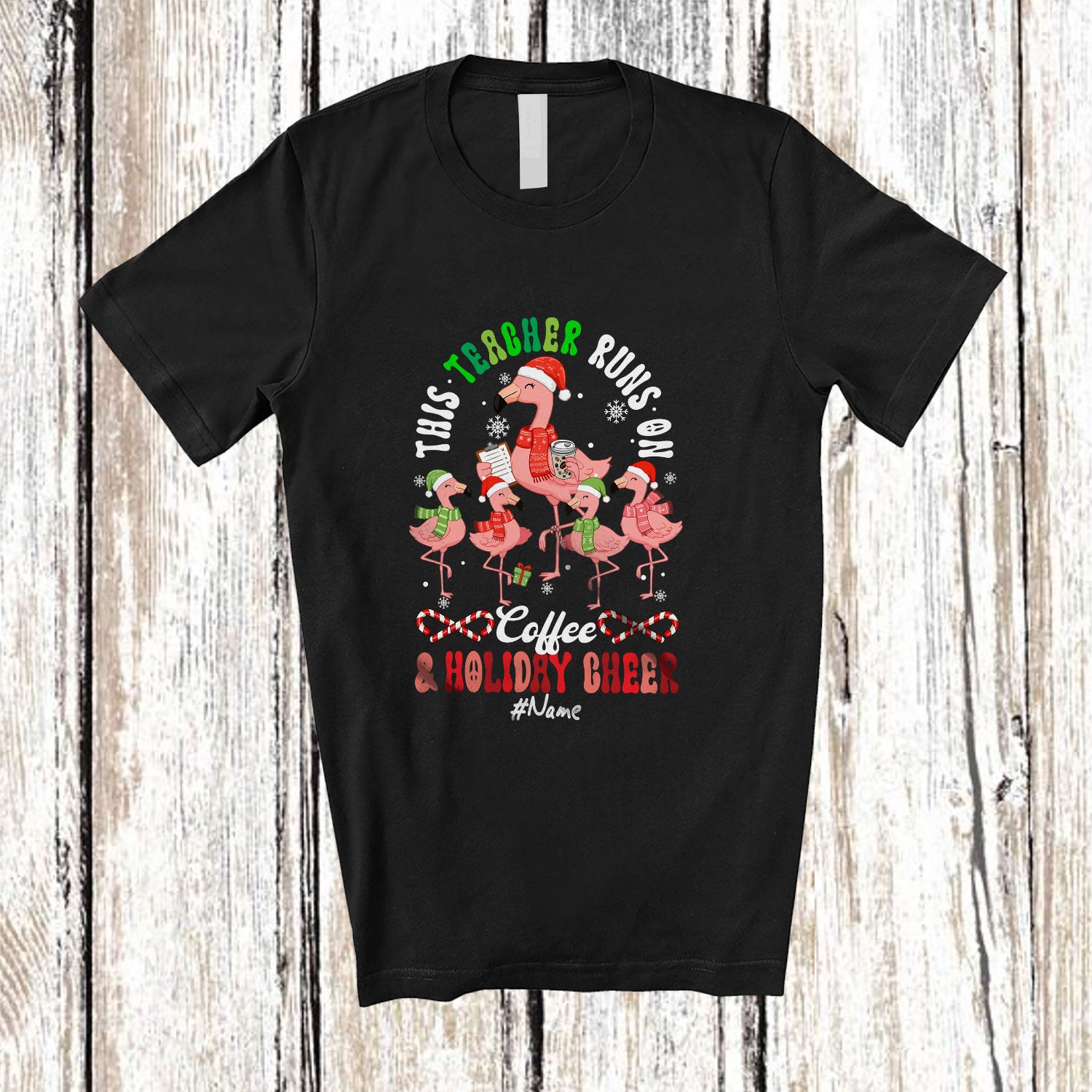 Personalized Custom Name Teacher Runs On Coffee Holiday Cheer; Joyful Christmas Flamingo Classroom T-Shirt